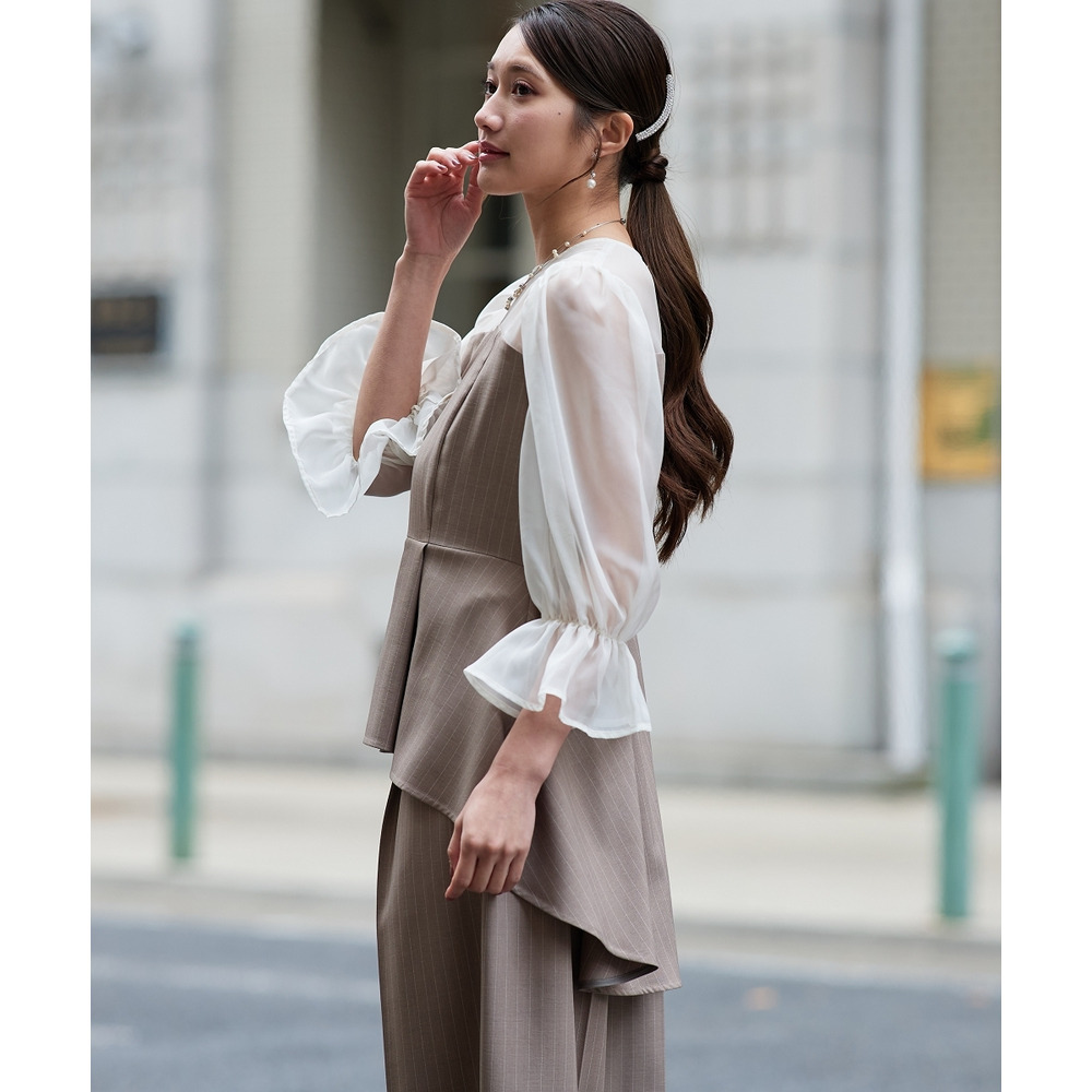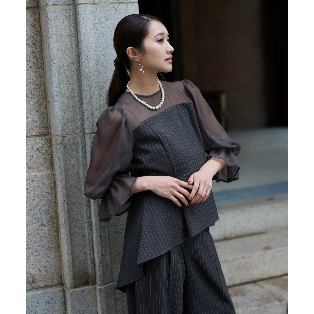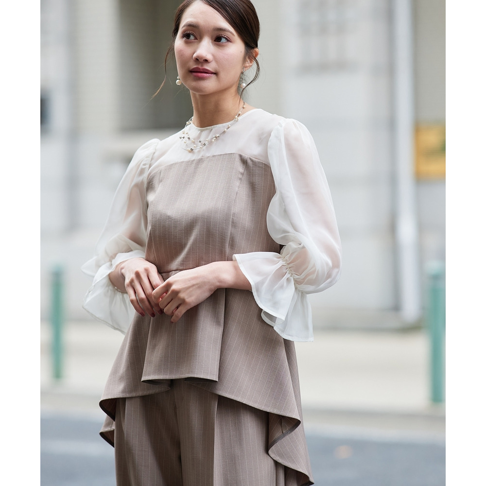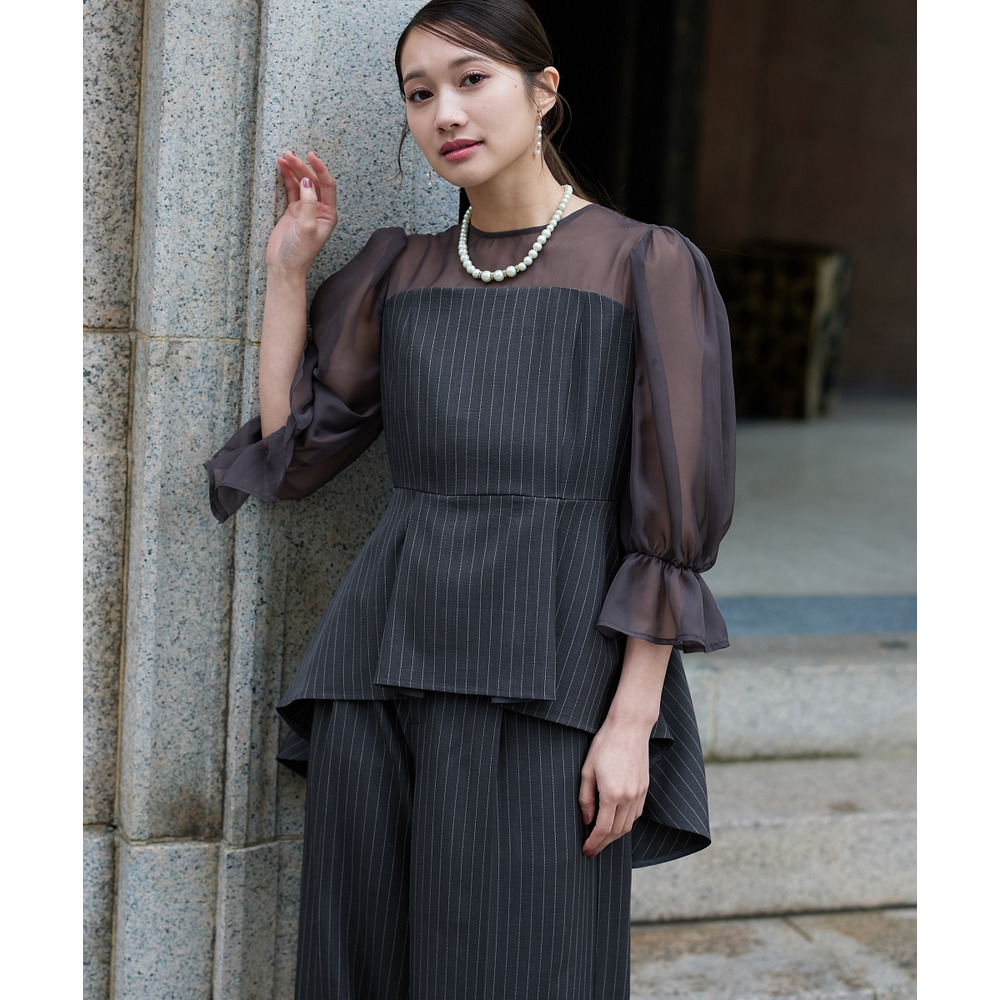 シアー素材の袖と、立体感のあるペプラムデザインが