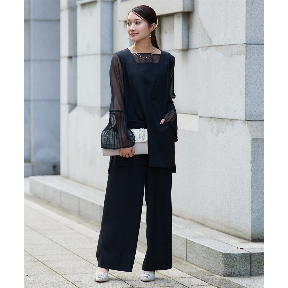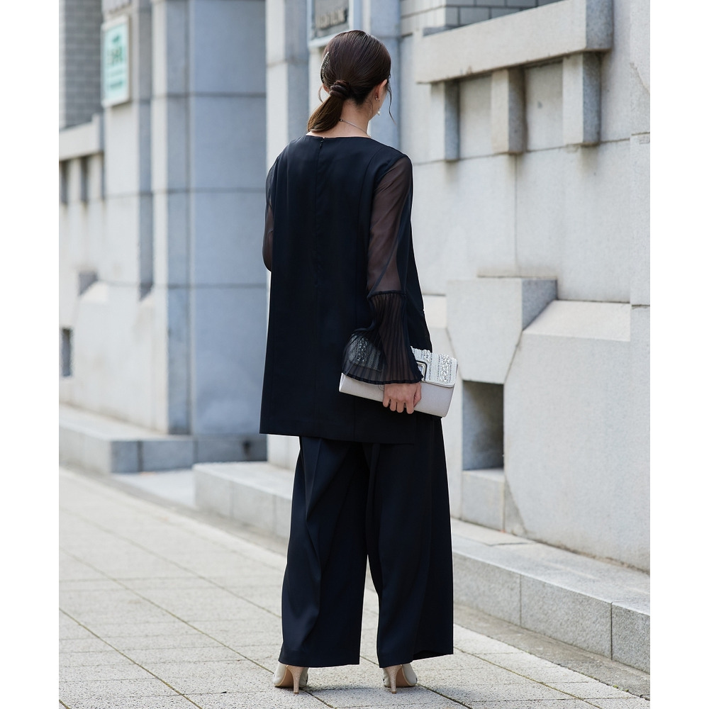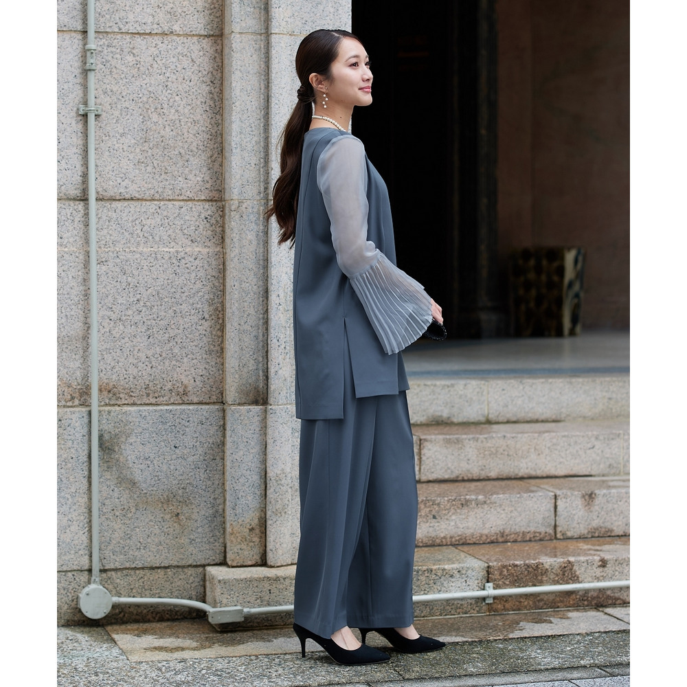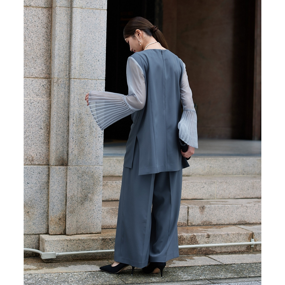【結婚式・パーティードレス】プリーツスリーブスクエアネックブラウス+ワイドパンツセットアップ 大きいサイズ