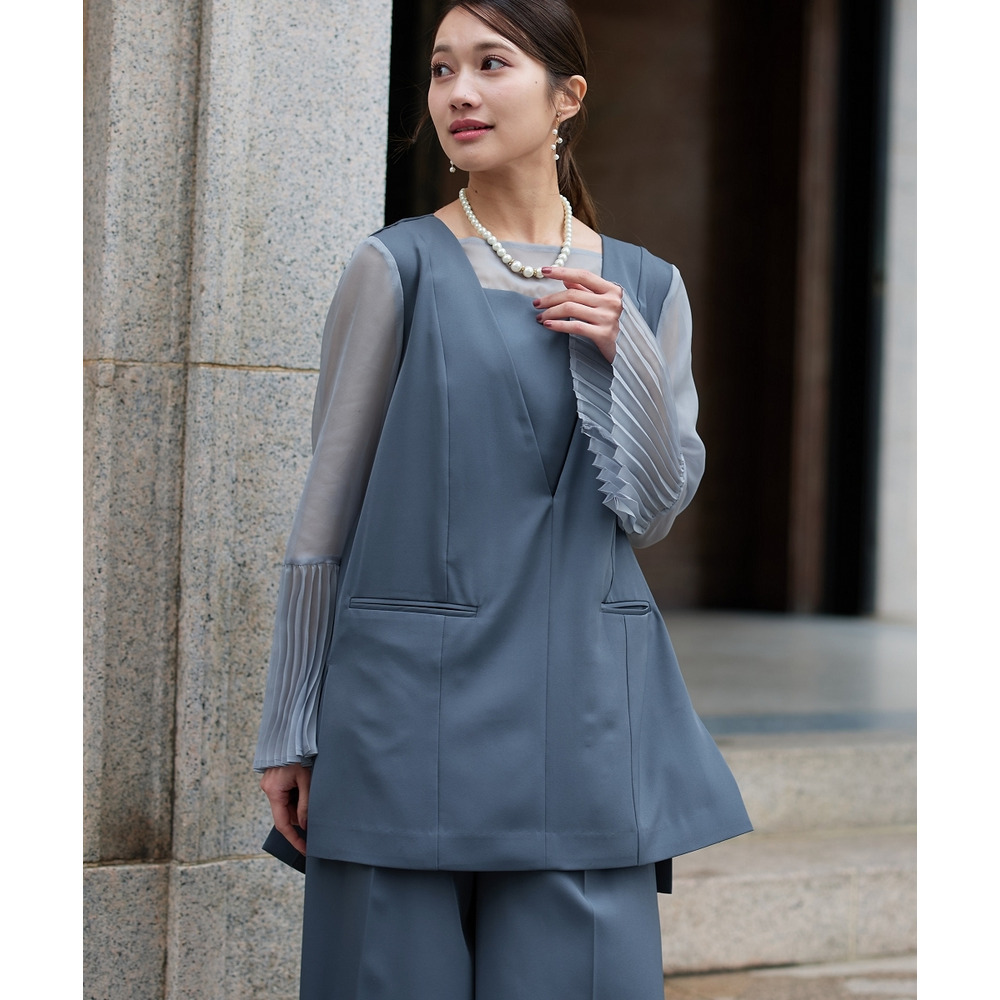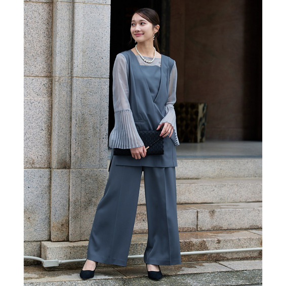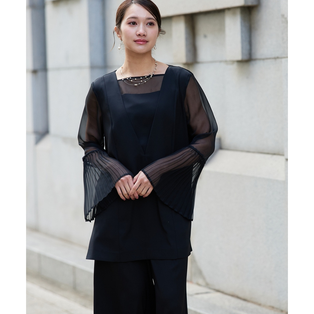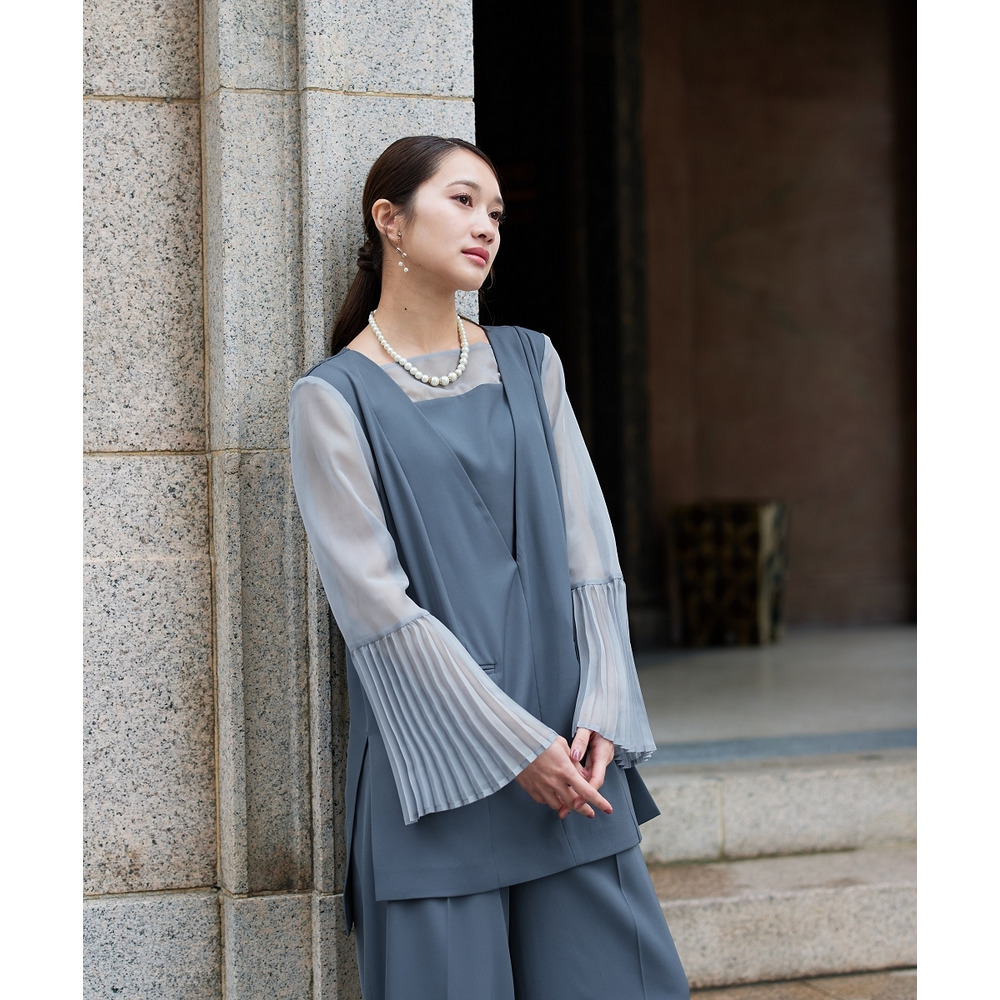 【結婚式・パーティードレス】プリーツスリーブスクエアネックブラウス+ワイドパンツセットアップ 大きいサイズ