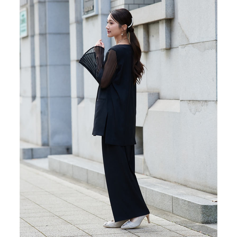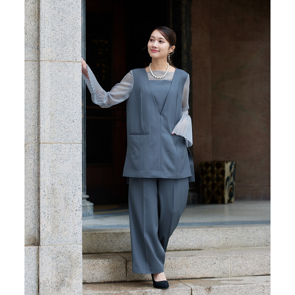 ・ブラウスの両脇スリットが、重たくなりがちなパンツスタイルに軽さをプラス