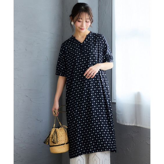 Vネックと縦に並んだボタンがゆったり楽なのにスッキリ見せてくれます。
