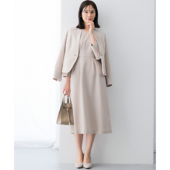 【レディーススーツ】キーネックジャケットアンサンブルスーツ(ジャケット+Vネック八分袖丈フレアワンピース) 大きいサイズ