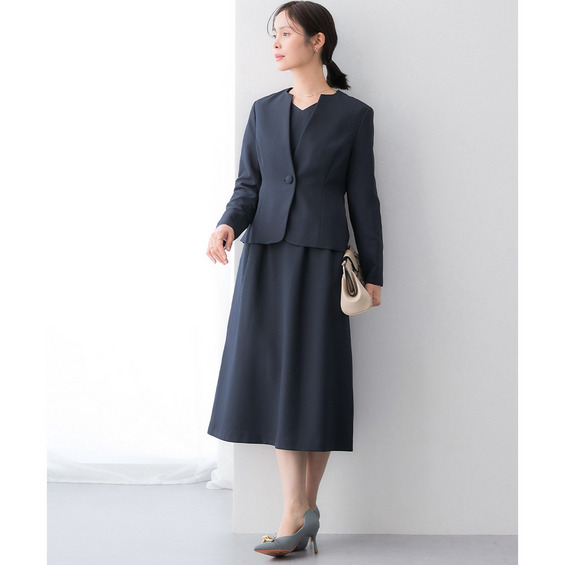 ワンピースの襟元のVネックはジャケットとの襟開きのバランスにこだわって設定しています♪