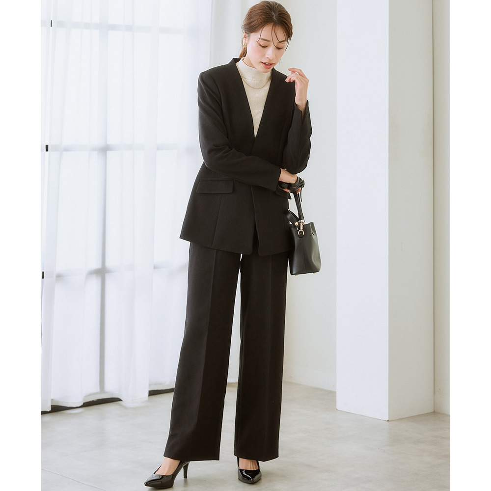 すっきりした縦ラインのノーカラーと、パンツのまっすぐなシルエット効果ですごく細見えします!パンツはお尻回りにゆとりがあり、そのままストンとまっすぐ落ちるデザインなので、ワイドというより太めのストレートパンツという感じ。