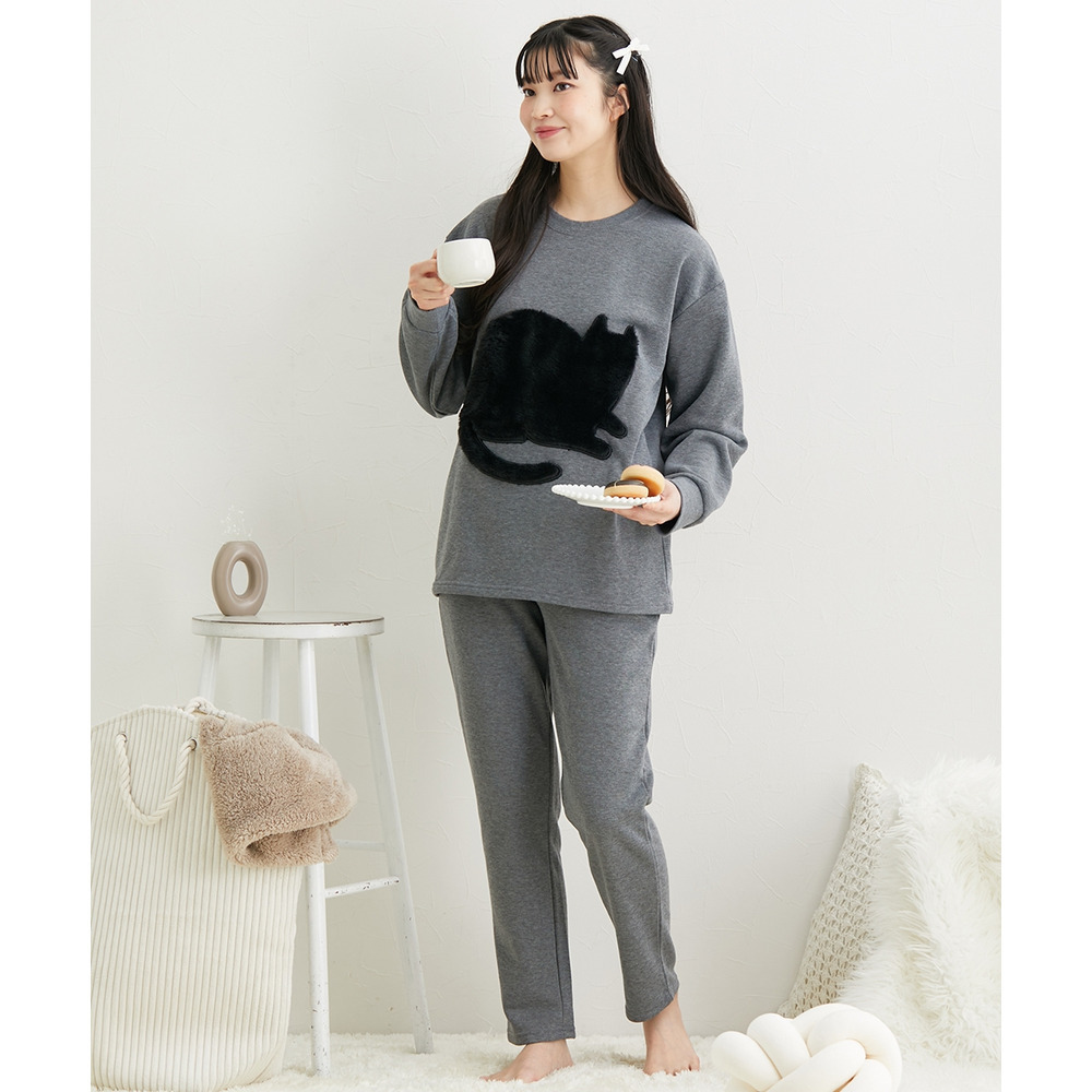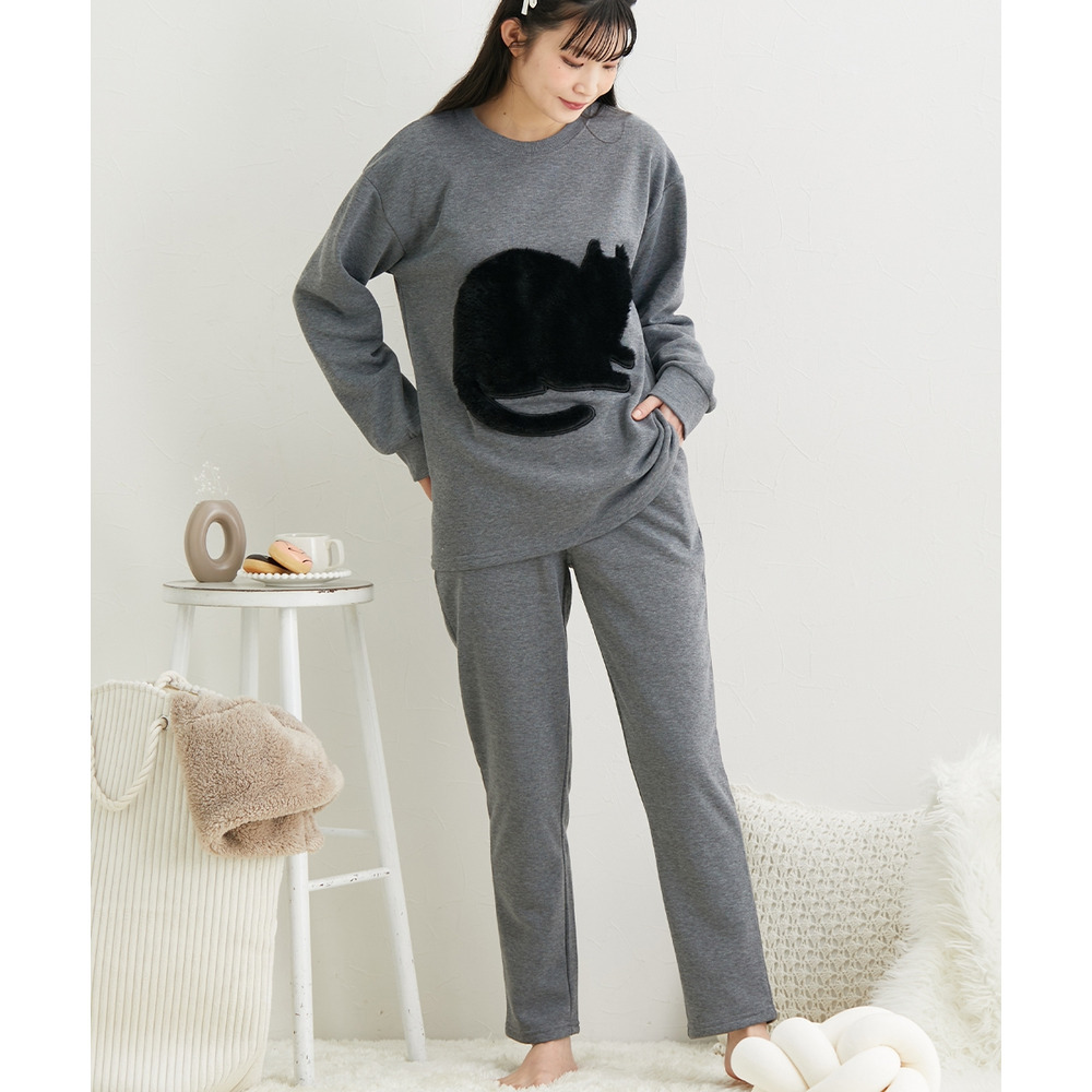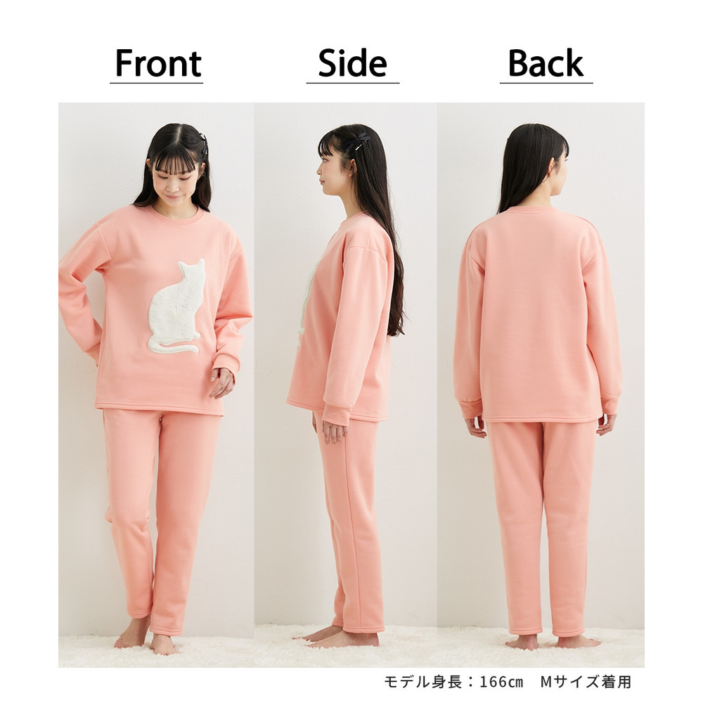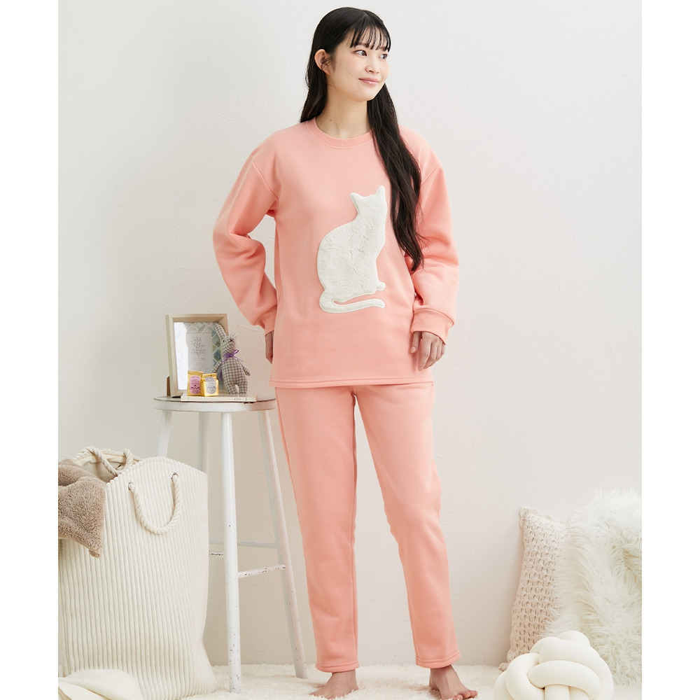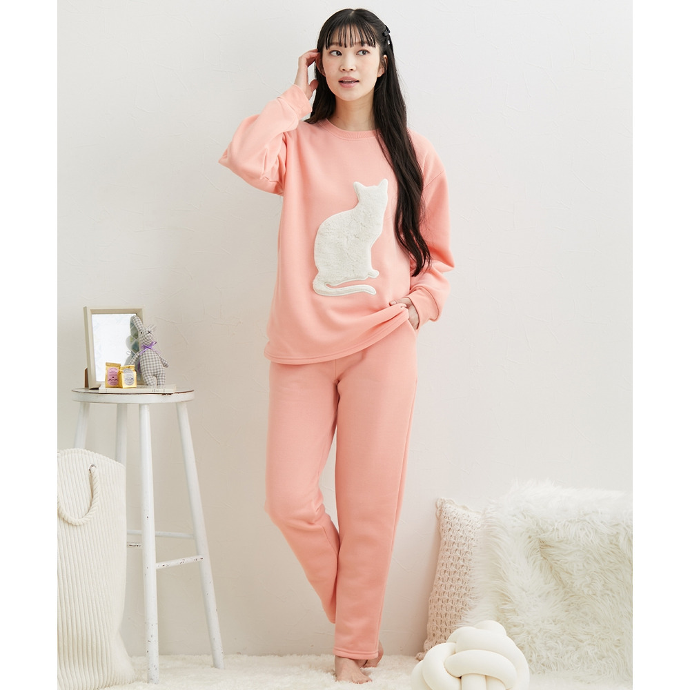 猫アップリケ付き裏起毛ルームウェア上下セット