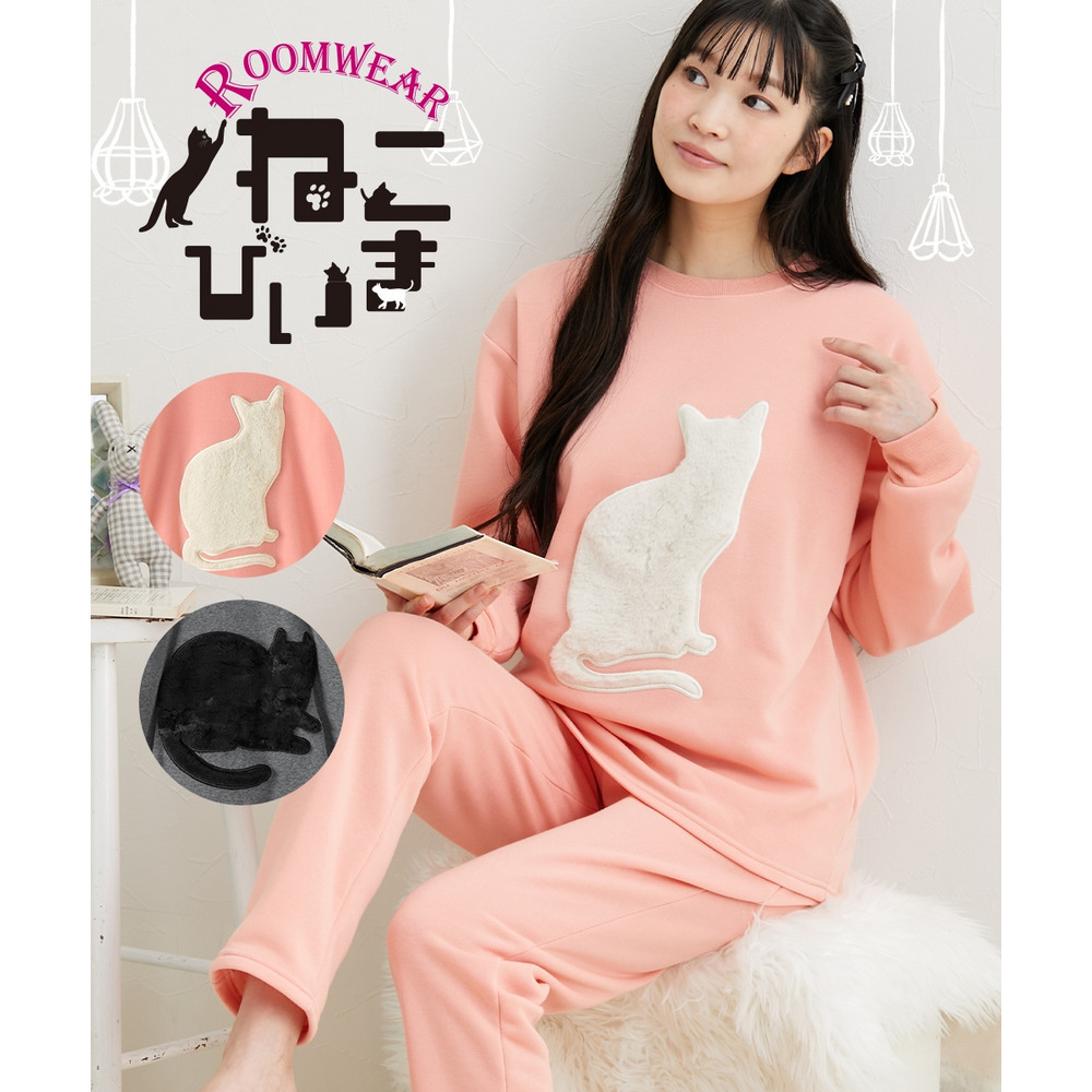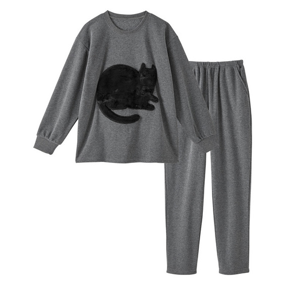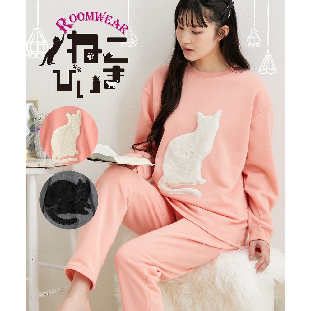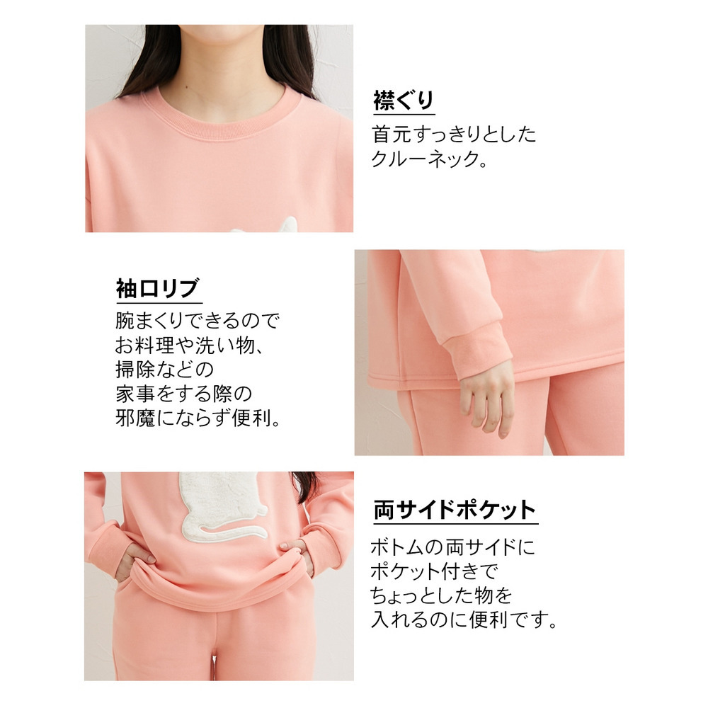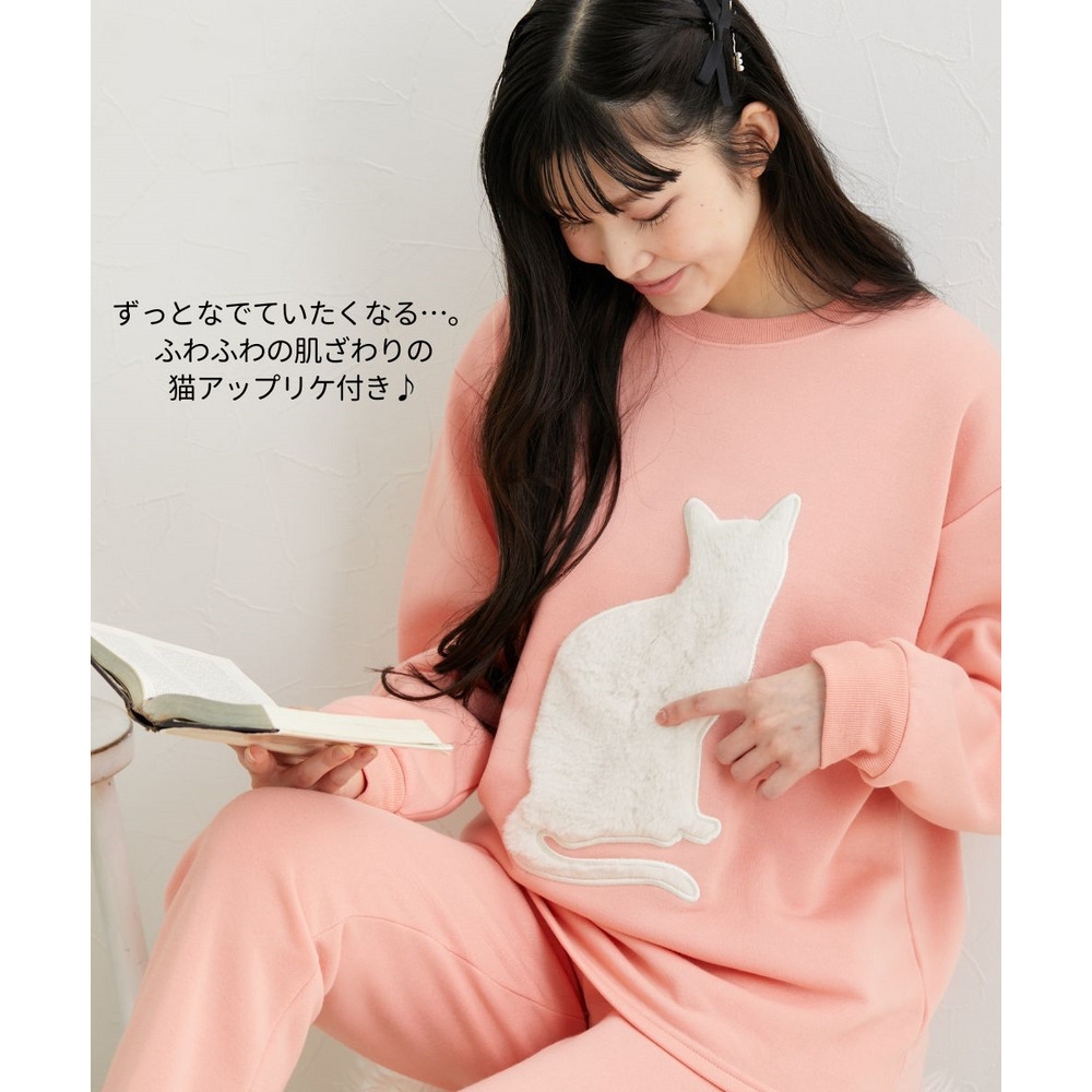 猫アップリケ付き裏起毛ルームウェア上下セット