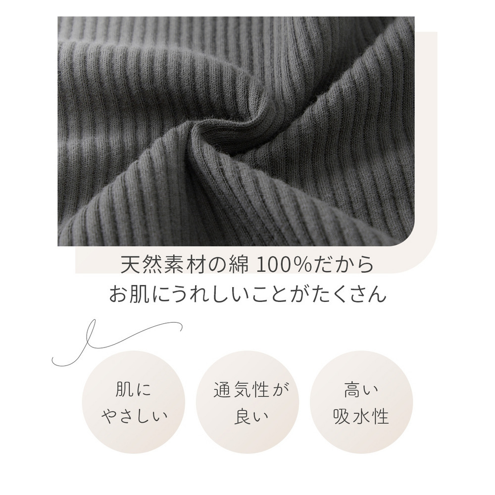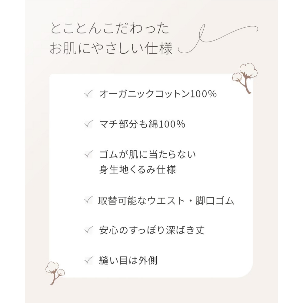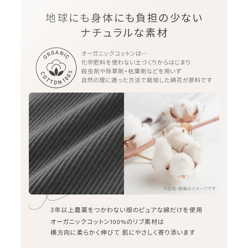 オーガニックコットン100%の身生地がお肌を優しく包みます。