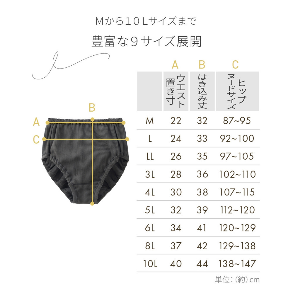 サイズ表記 L LL 3L 4L 5L 6L 8L 10L ウエスト:(置き寸) 24 26 28 30 32 34 37 40 はき込み丈 33 35 36 38 39 41 42 44 ヒップ(ヌードサイズ) 92~100 97~105 102~110 107~115 112~120 120~129 129~138 138~147