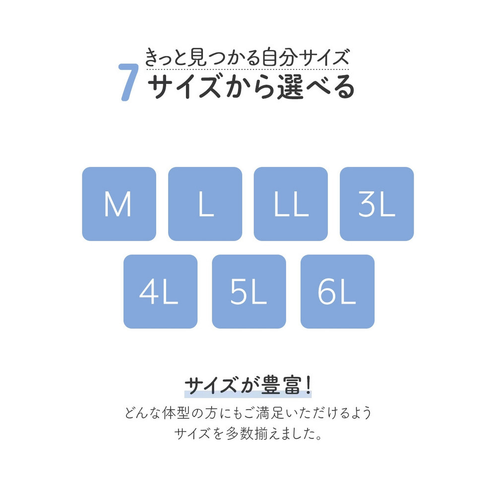 Mサイズから6Lサイズまで、どんな体形の方にもご満足いただけるよう、サイズを多数揃えました。