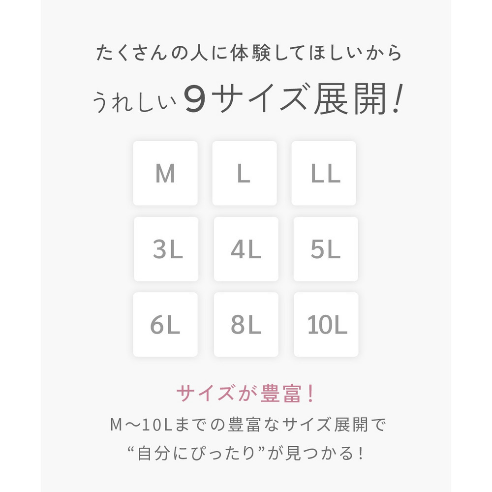 Mサイズから10Lサイズまで、どんな体形の方にもご満足いただけるよう、サイズを多数揃えました。