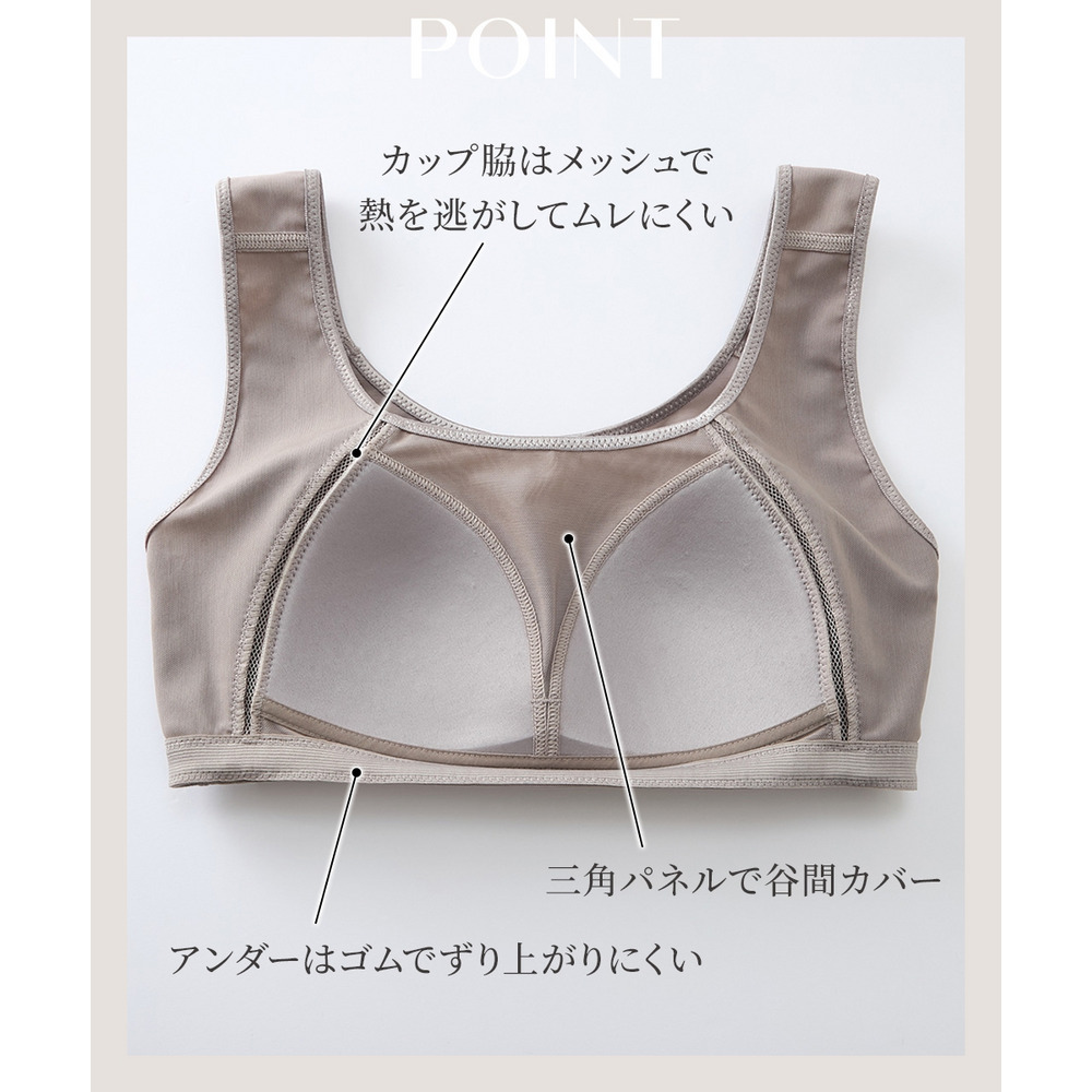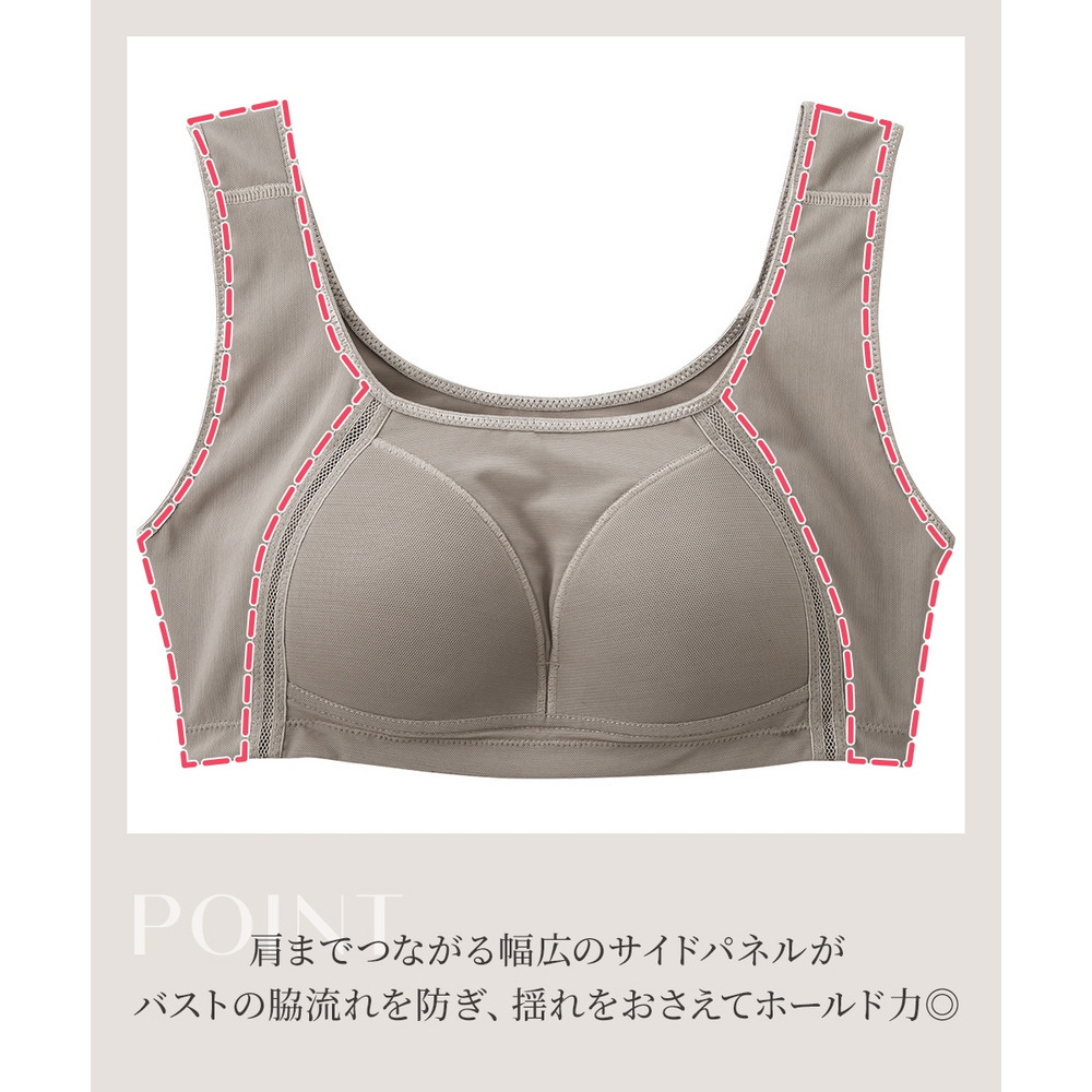・肩までつながるサイドパネルがバストの脇流れを防ぎ、揺れをおさえる