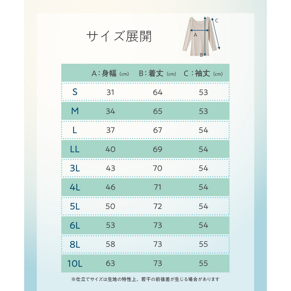 サイズ表記 L LL 3L 4L 5L 6L 8L 10L 着丈 67 69 70 71 72 73 73 73 身幅 37 40 43 46 50 53 58 63 袖丈 54 54 54 54 54 54 55 55