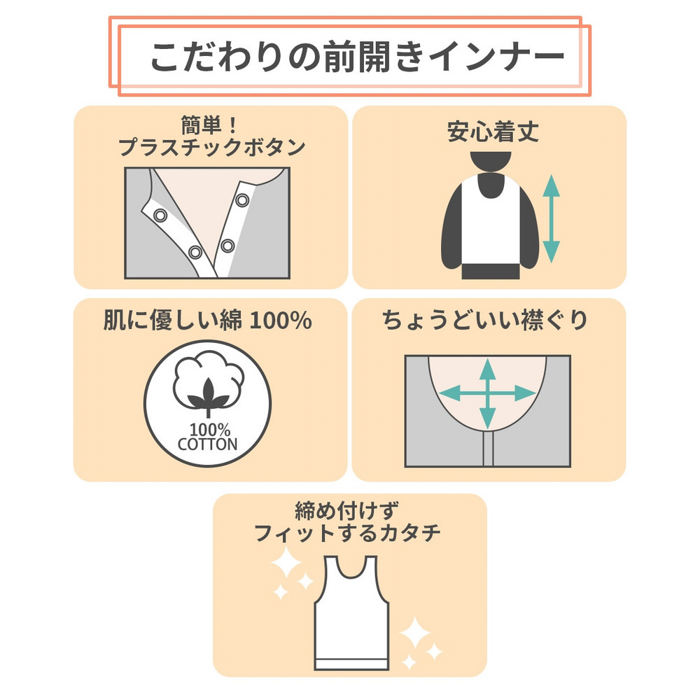 身生地は天然素材の綿100%、さらにボタンが肌に直接当たらないようにすることで、お肌への優しさを考えました。