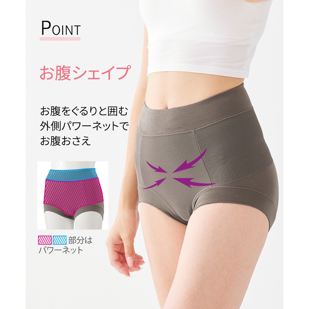 お腹をぐるりと囲む幅広パワーネットでお腹をおさえます