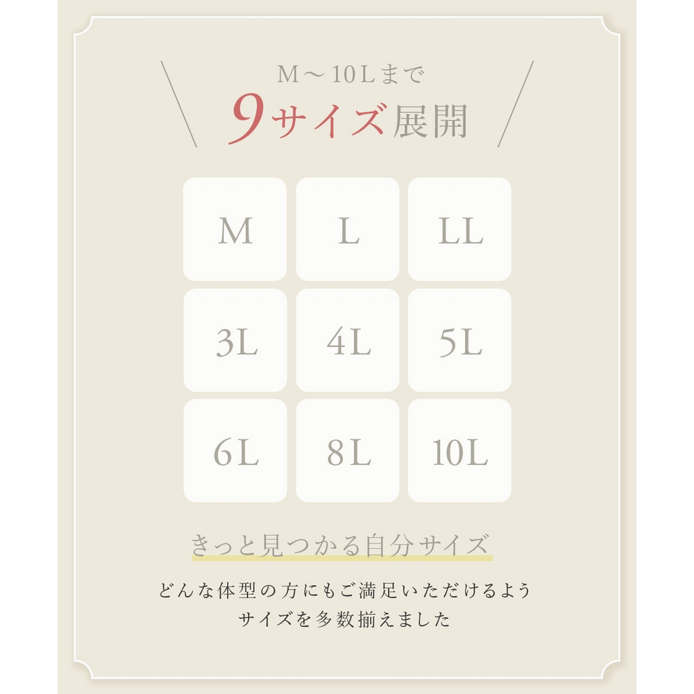 Mサイズから10Lサイズまで、どんな体型の方にもご満足いただけるよう、サイズを多数揃えました。