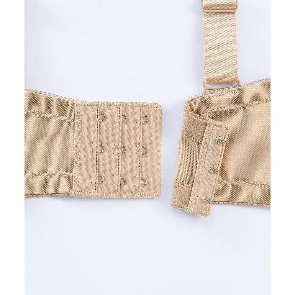 | 素材 | 品質=ポリエステル・ナイロン・その他 フルカップ ワイヤーなし 後ホック3段3列 サイドボーン入り パッドなし カップ裏・肩裏メッシュ生地は吸汗速乾で、全色共通ベージュ。 |