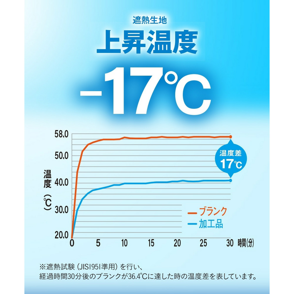 ・日傘と同じ生地を使用し上昇温度-17℃*遮熱試験(JIS1951準用)を行い、経過時間30分後のブランクが36.4℃に達した時の温度差を表しています