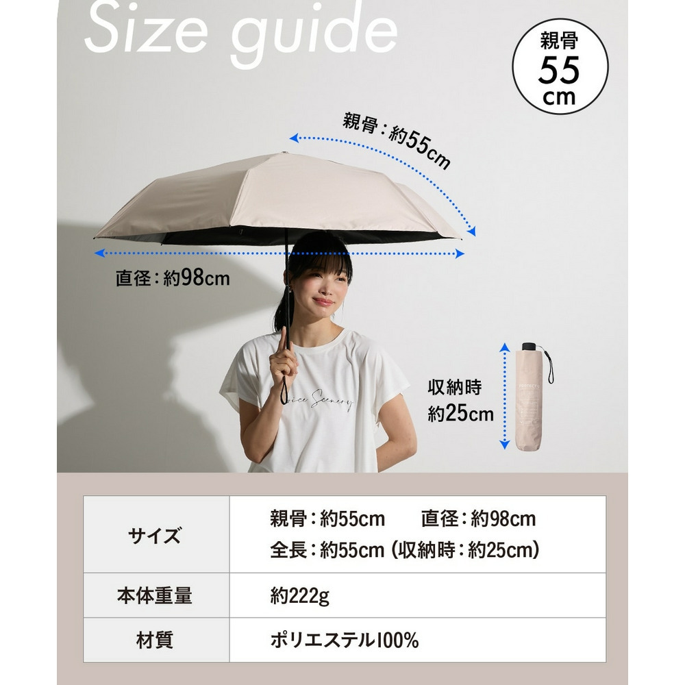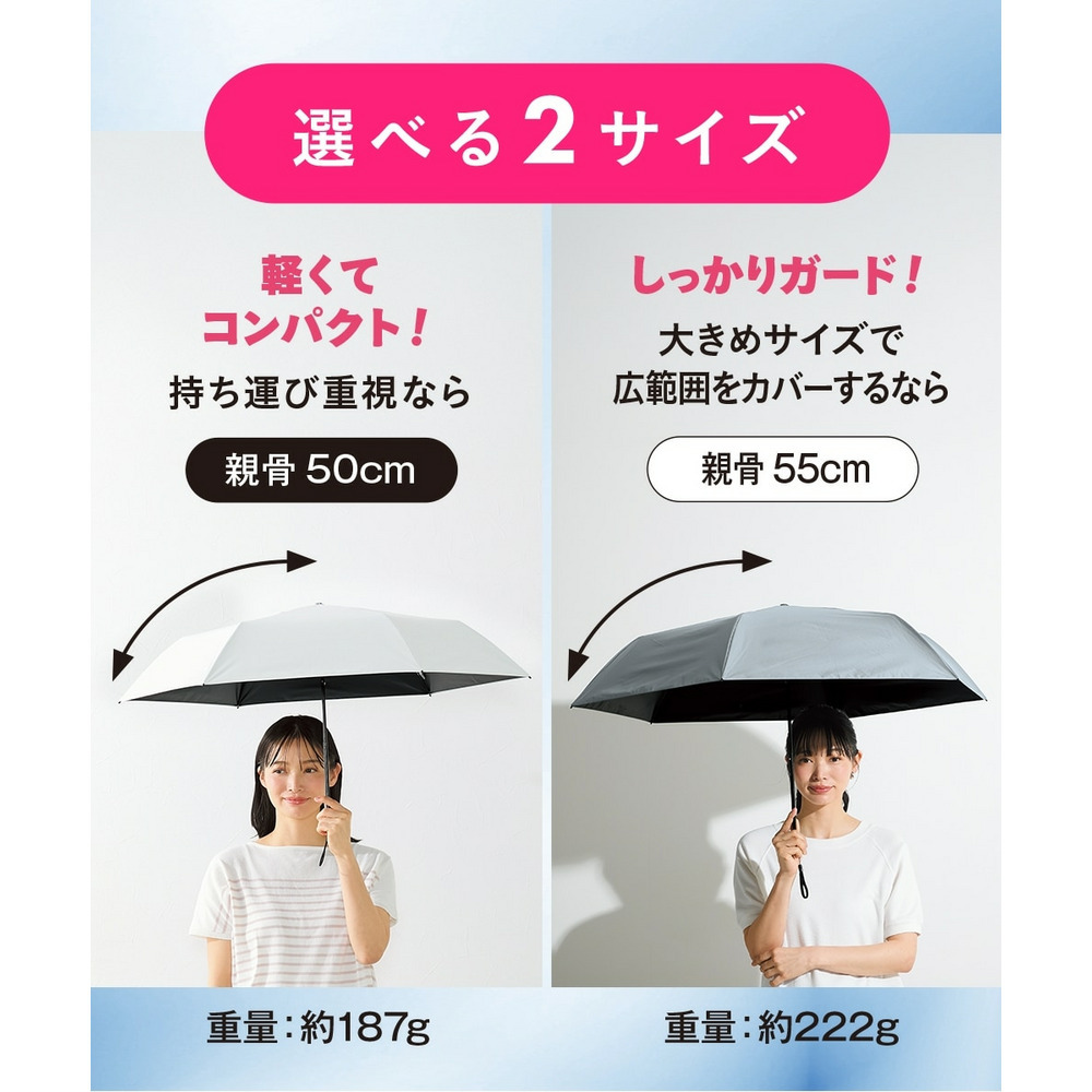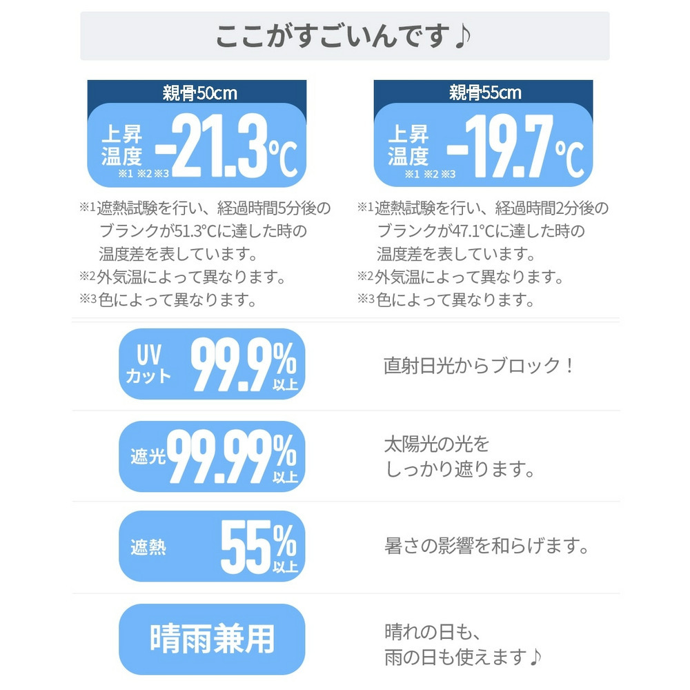素材 材質=ポリエステル100% 本体サイズ=【親骨約55cm】全長:約55cm(収納時:約25cm)  直径:約98cm 親骨:約55cm 重量=約222g 本体サイズ=【親骨約50cm】全長:約48.5cm(収納時:約21.5cm)  直径:約88cm 親骨:約50cm 重量=約187g
