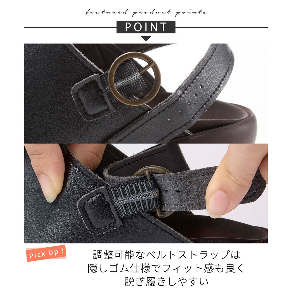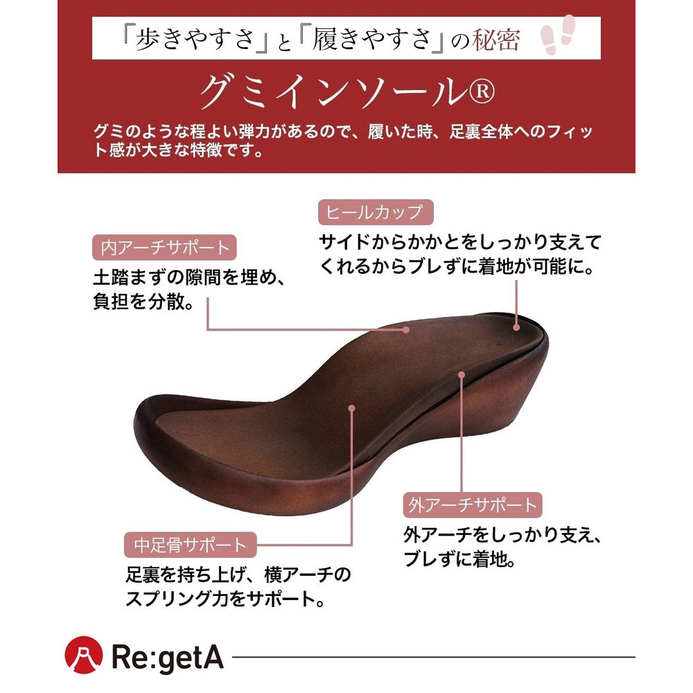 | 素材 | 材質=合成皮革 底材=合成底(ポリウレタン) 底の厚さ(前)=約2cm 底の厚さ(後ろ)=約5cm ワイズ=4E相当 重量=約270g(4E相当:Lサイズ片足) グミソール使用 ※生産時期や素材などによって多少個体差があります。 |