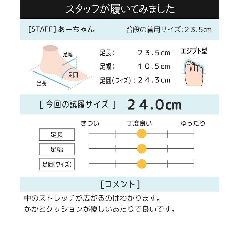 着用スタッフ:あーちゃん(普段の着用サイズ:23.5cm/今回の試履サイズ:24㎝)