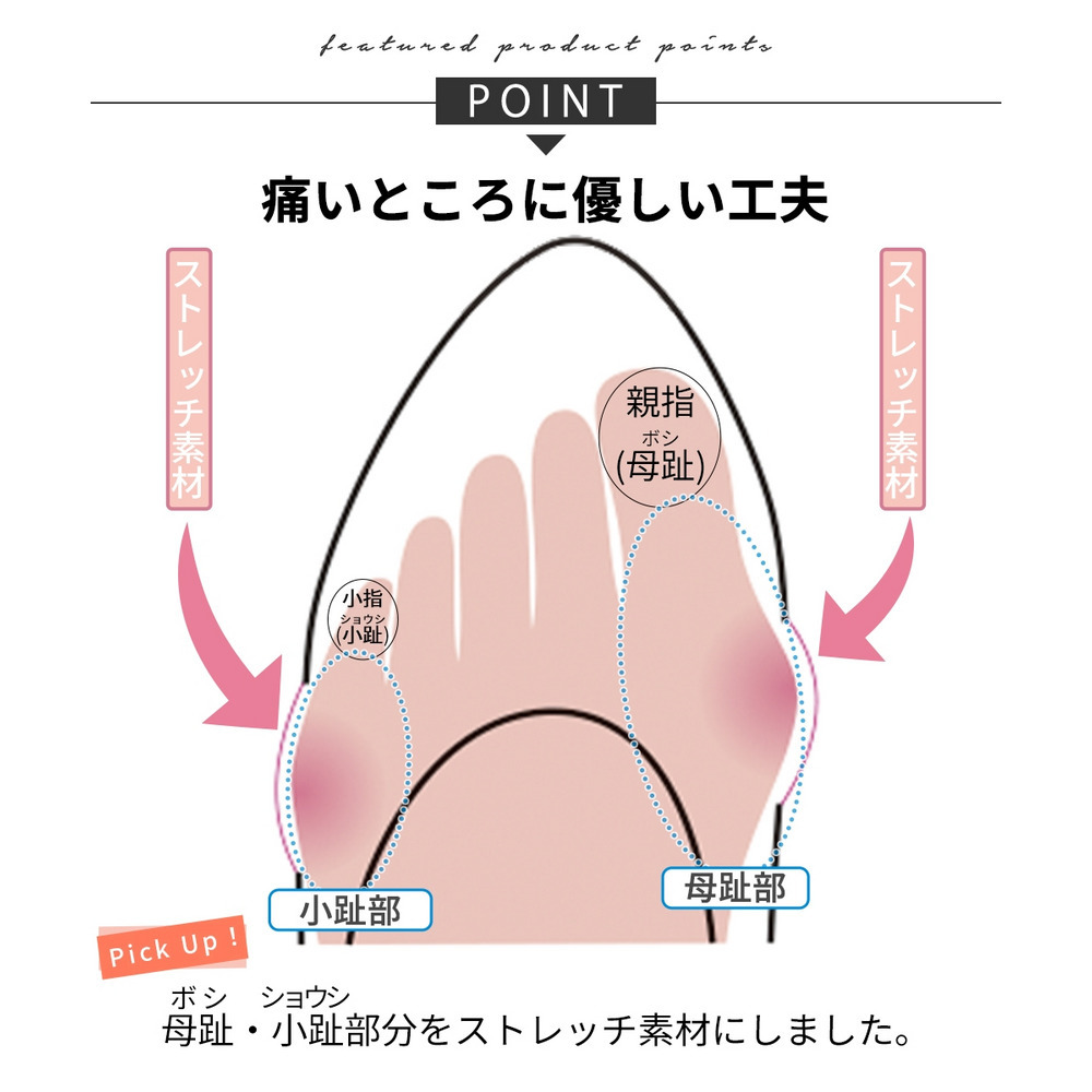 さらに母趾・小趾部分にストレッチ素材を入れ、足の付け根部分の圧迫を軽減。