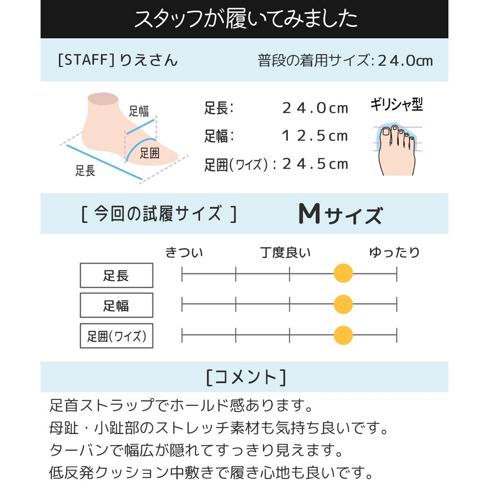 着用スタッフ:りえさん(普段の着用サイズ:24cm/今回の試履サイズ:Mサイズ)