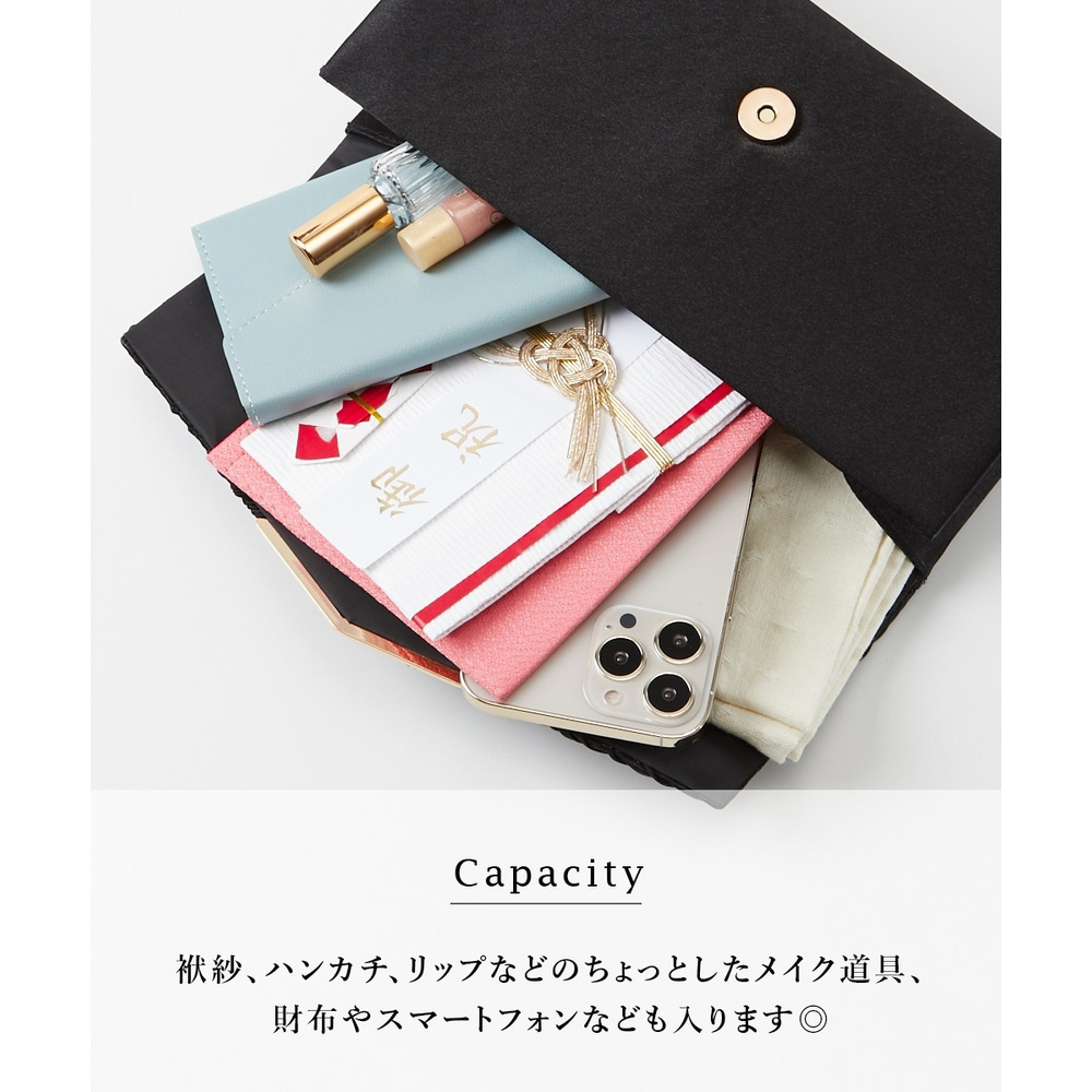 シーンに合わせてクラッチバッグ、ショルダーバッグ、ハンドバッグの3WAYでお楽しみいただけます♪袱紗、ハンカチ、財布、スマートフォン、リップなど必要最低限の荷物が入るサイズ感◎