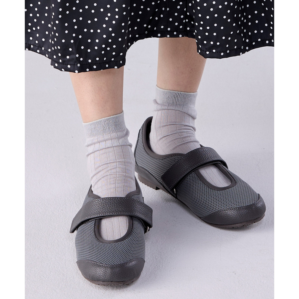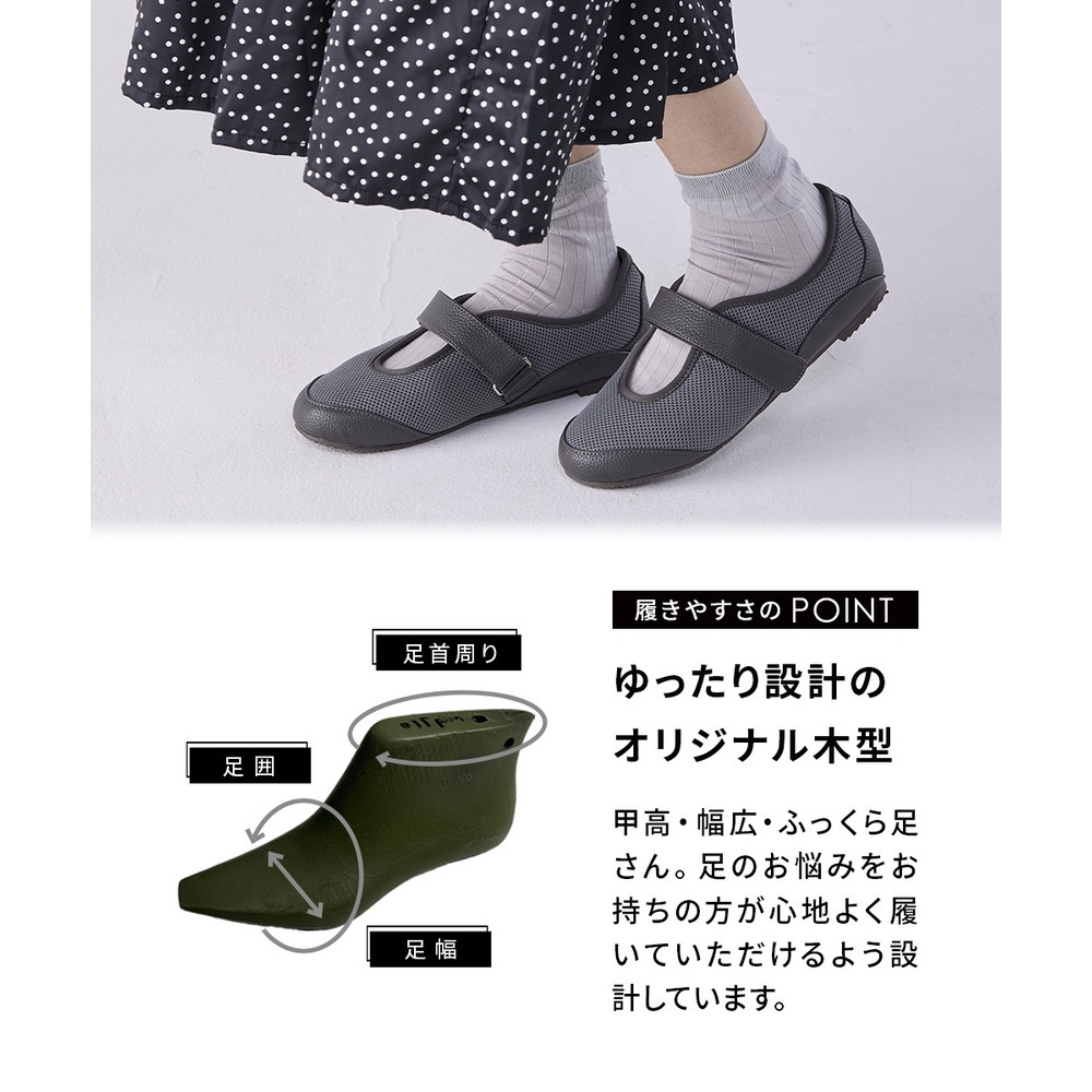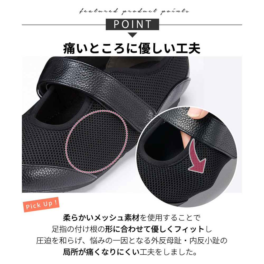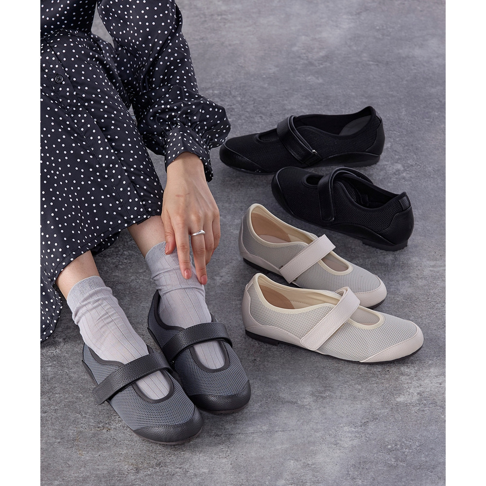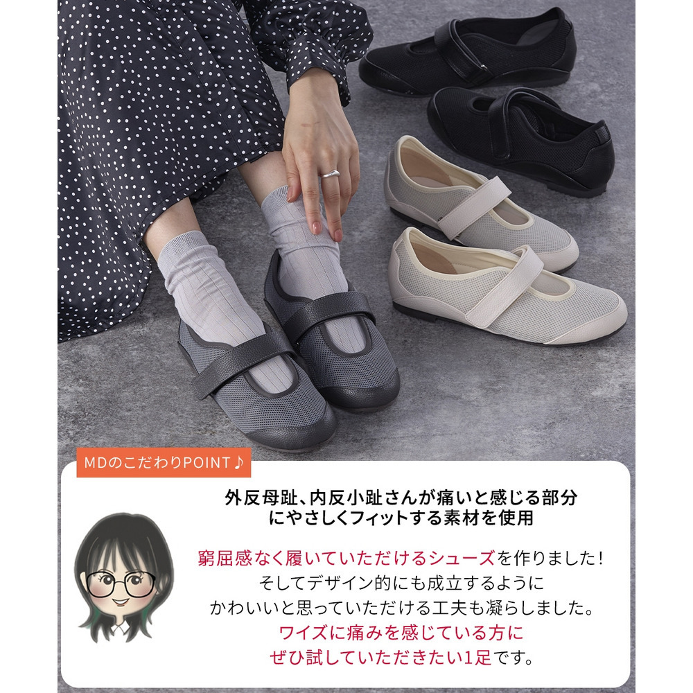 外反母趾、内反小趾さんが痛いと感じる部分にやわらかいメッシュ素材をあしらうことで、窮屈感なく履いていただける仕様に仕立てたベルトシューズ。