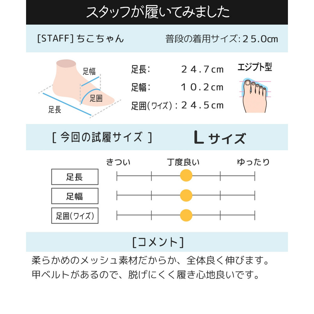 着用スタッフ:ちこちゃん(普段の着用サイズ:25cm/今回の試履サイズ:L)
