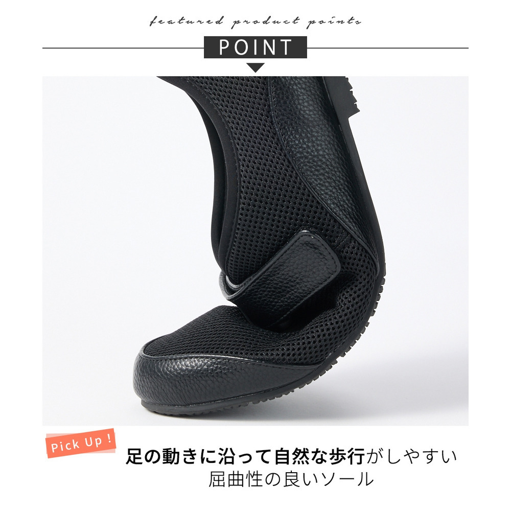 素材 材質=合成繊維・合成皮革 底材=合成底 底の厚さ(後ろ)=約1cm ワイズ=4E 重量=約220g(4E:Lサイズ片足) ※生産時期や素材などによって多少個体差があります。 母趾・小趾部には柔らかいメッシュ素材を使用