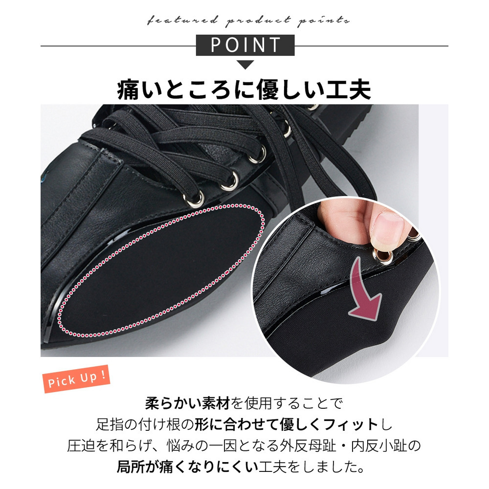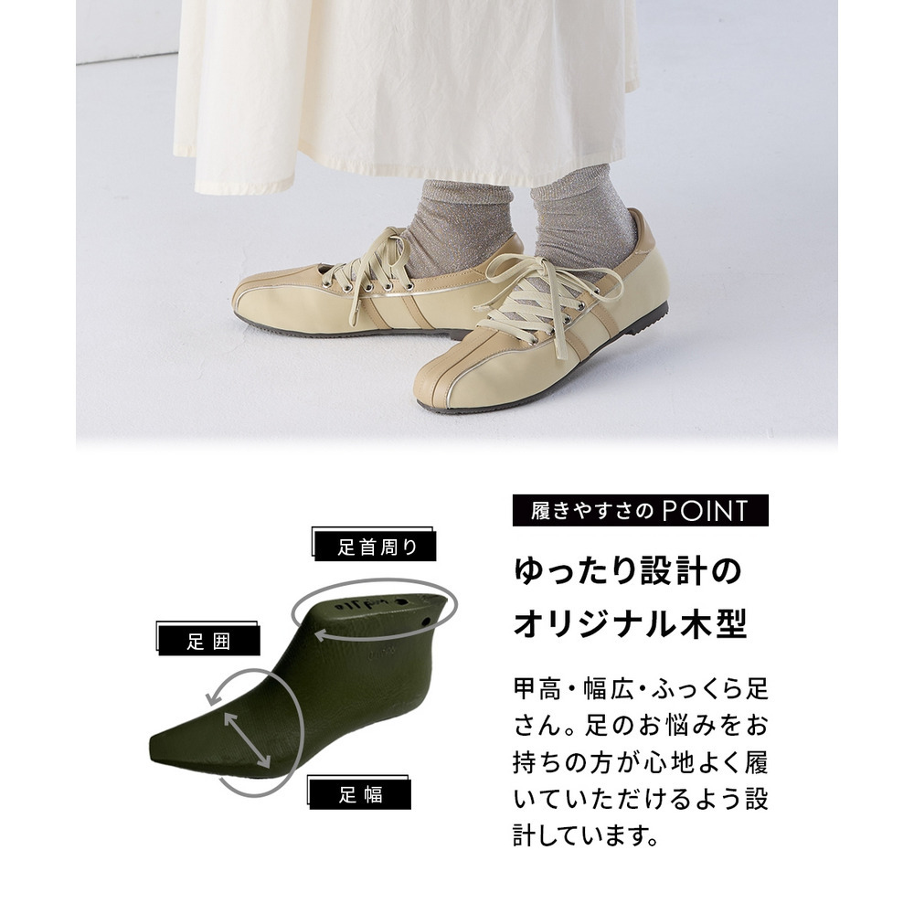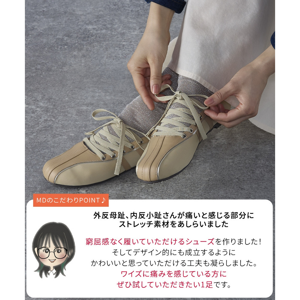 外反母趾さん、内反小趾さんが痛いと感じる部分にストレッチ素材をあしらうことで、窮屈感なく履いていただける仕様に仕立てたレースアップシューズ。