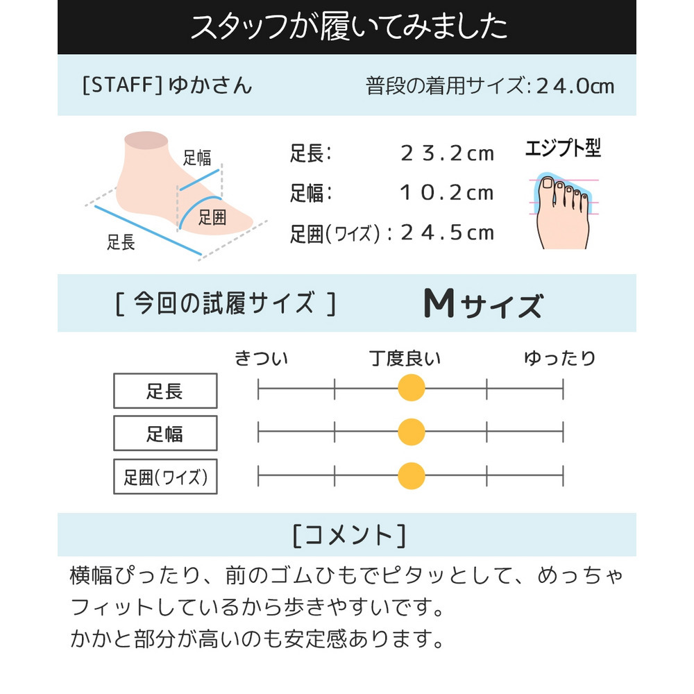 着用スタッフ:ゆかさん(普段の着用サイズ:24cm/今回の試履サイズ:M)