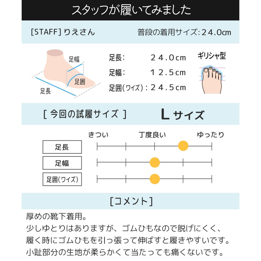 着用スタッフ:りえさん(普段の着用サイズ:24cm/今回の試履サイズ:L)