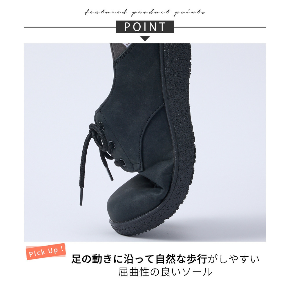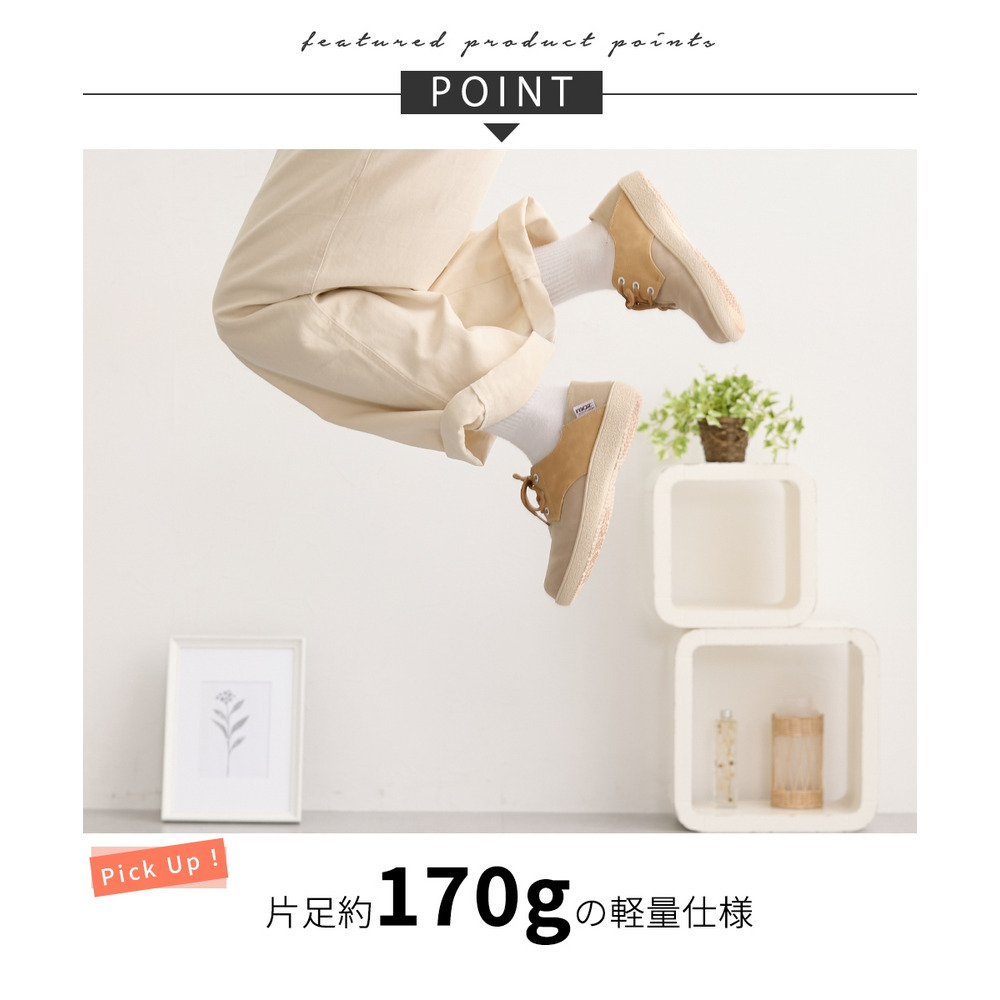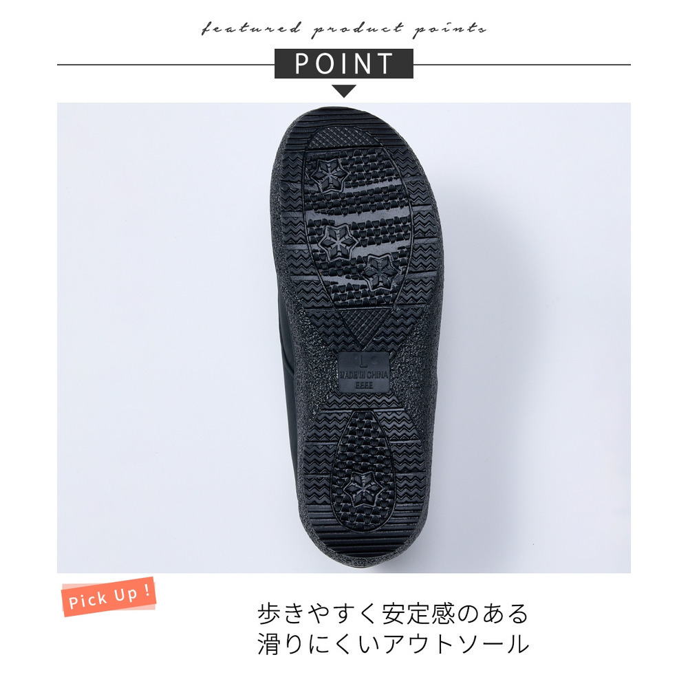 | 素材 | 材質=合成皮革・合成繊維 底材=合成底 底の厚さ(後ろ)=約3cm ワイズ=4E 重量=約170g(4E:Lサイズ片足) ※生産時期や素材などによって多少個体差があります。 |
