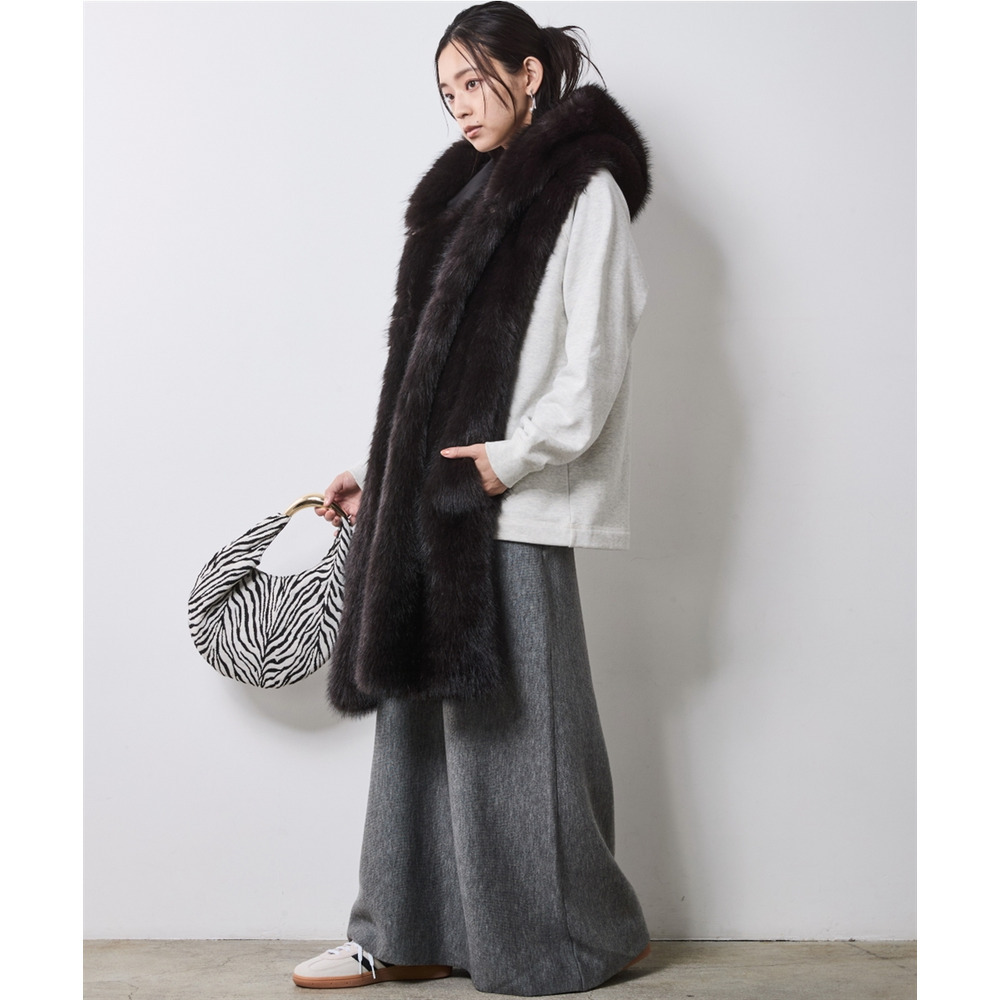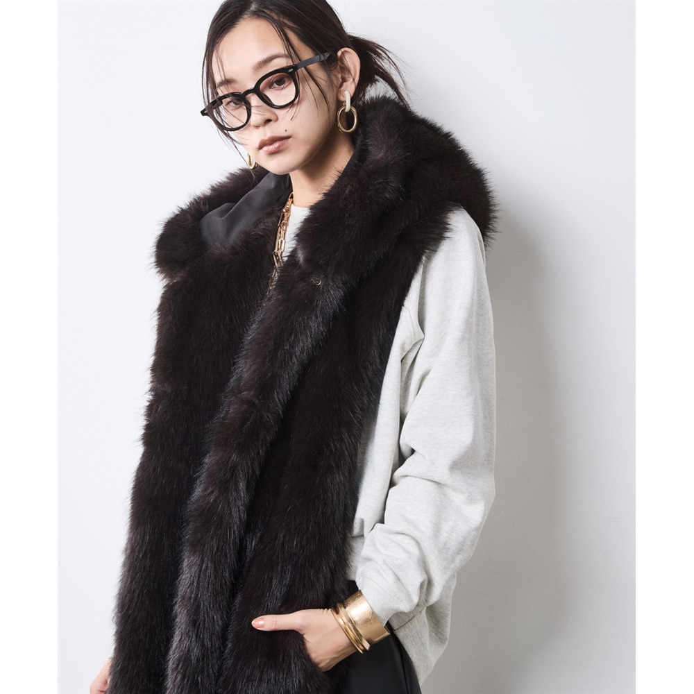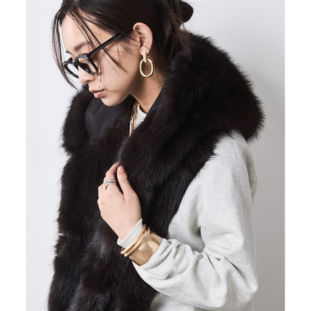顔周りを華やかに彩るボリューム感のあるフェイクファーマフラー。