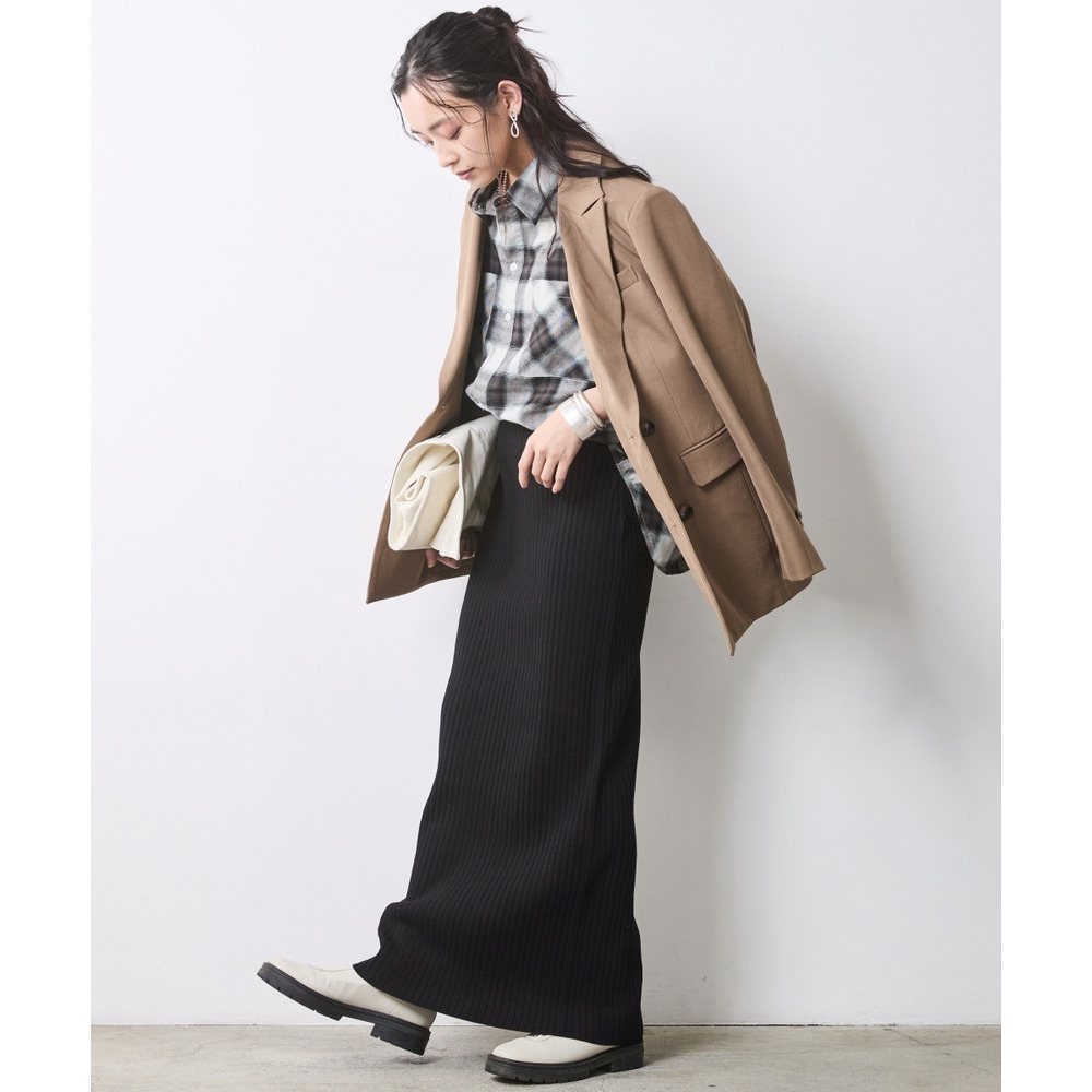 Effortless Mix: 襟を大きく抜いてラフに羽織り、タイトなインナーとのギャップを楽しむ抜け感レイヤード。