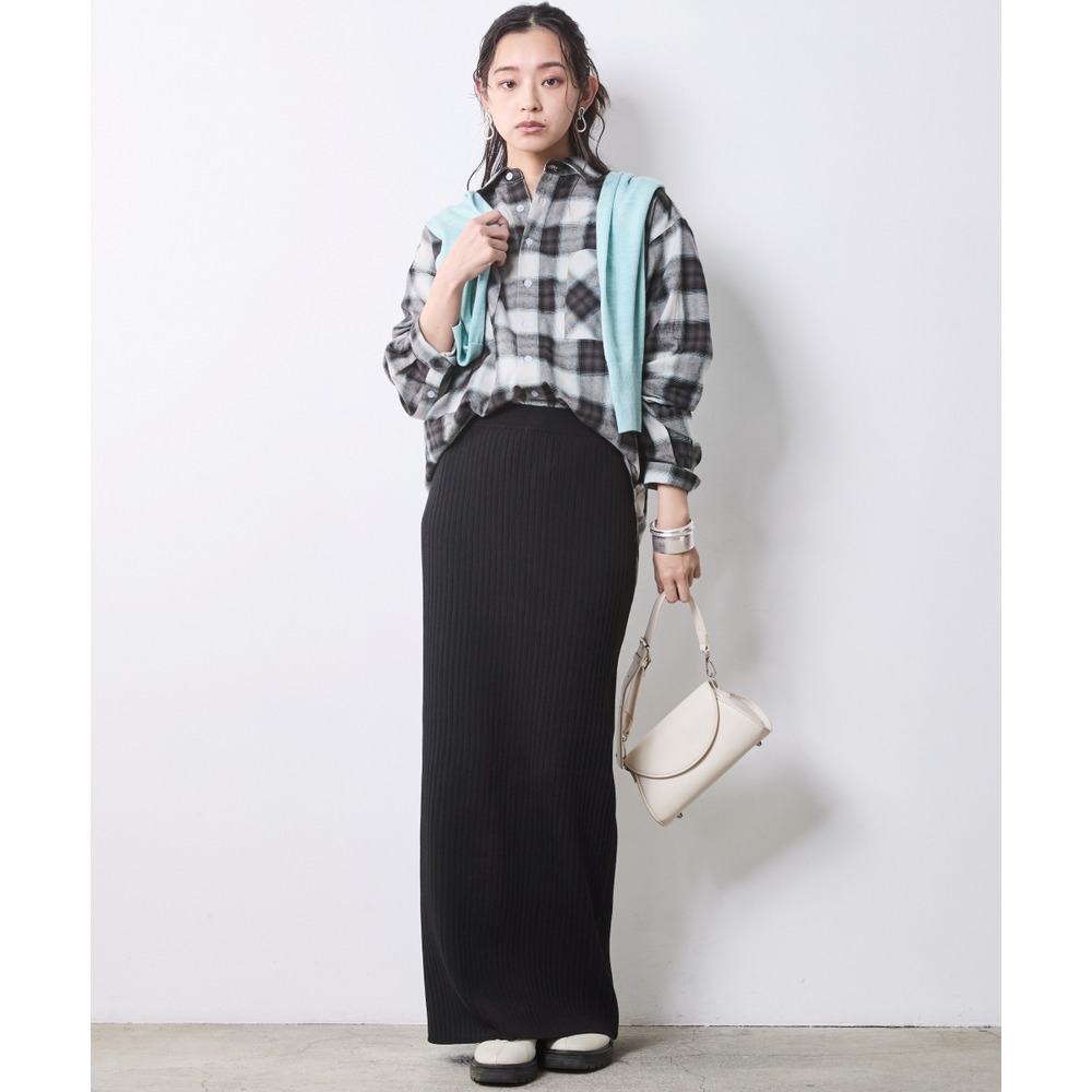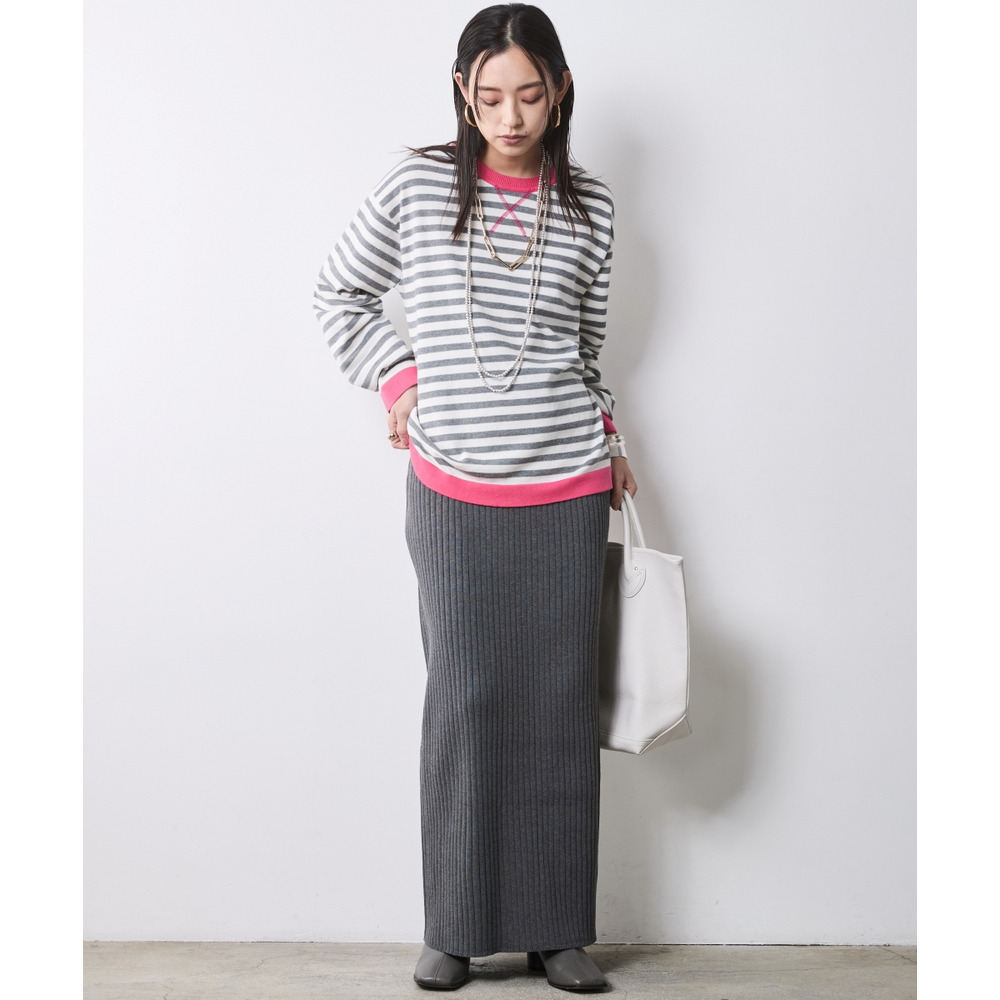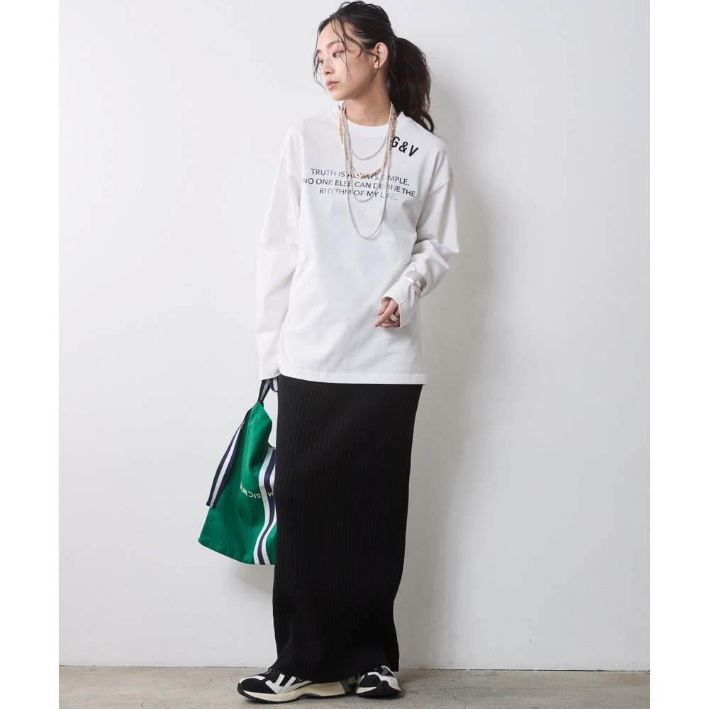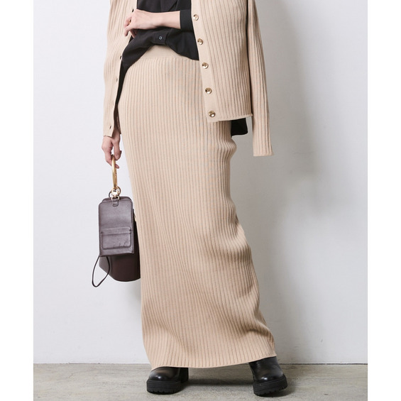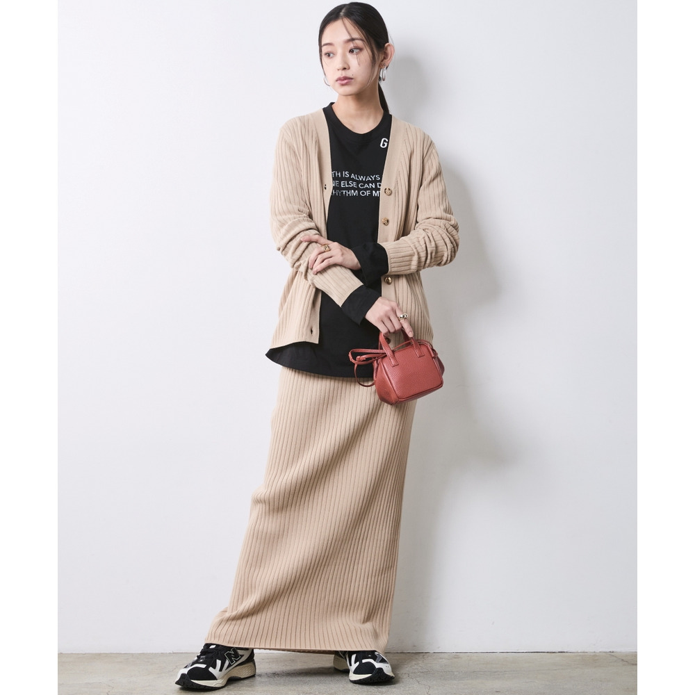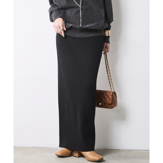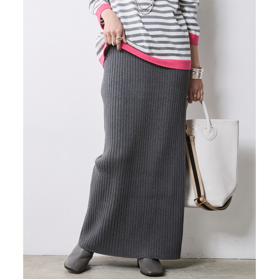 カジュアルなトップスも、リブスカートの縦ラインが加われば一気に洗練された表情に変わります。