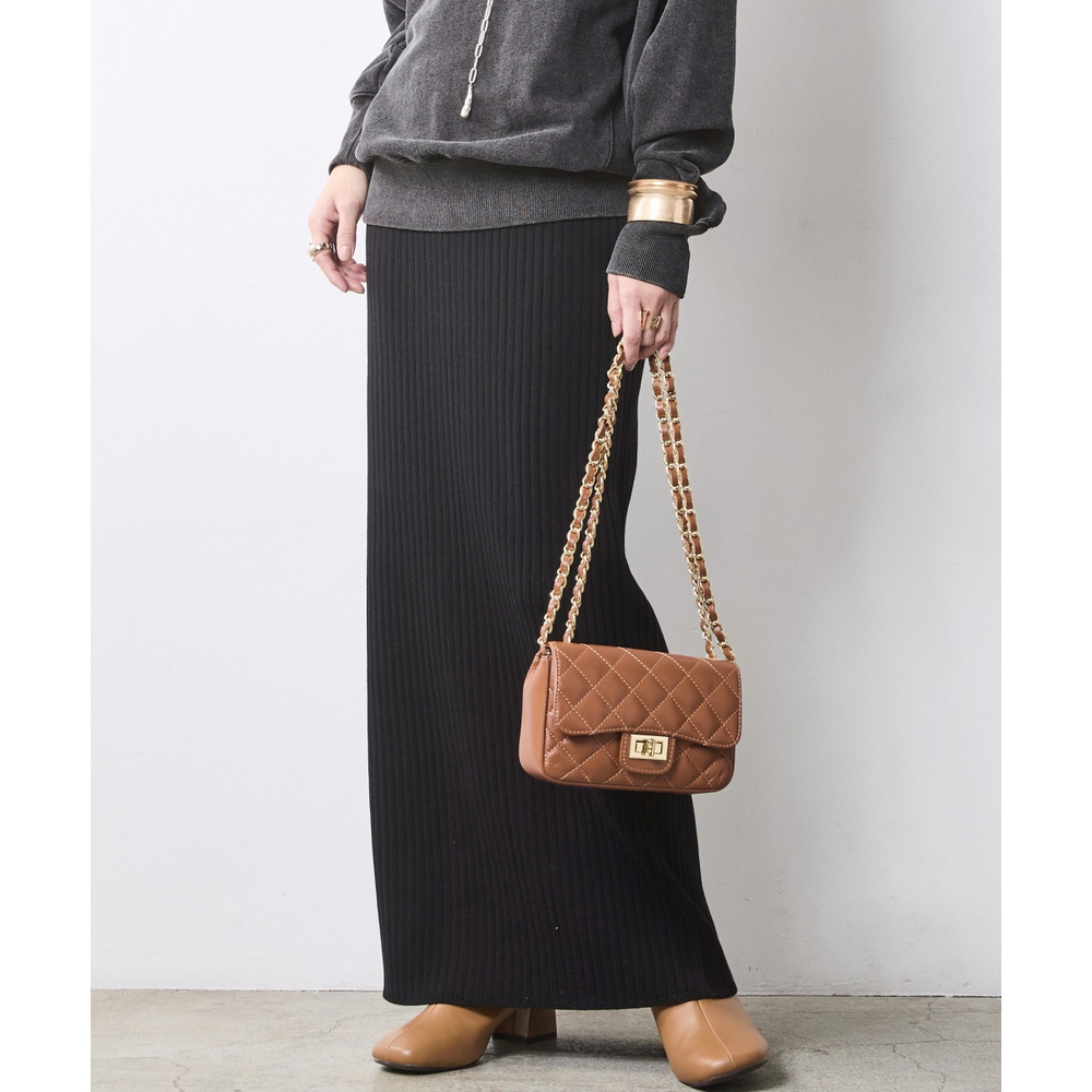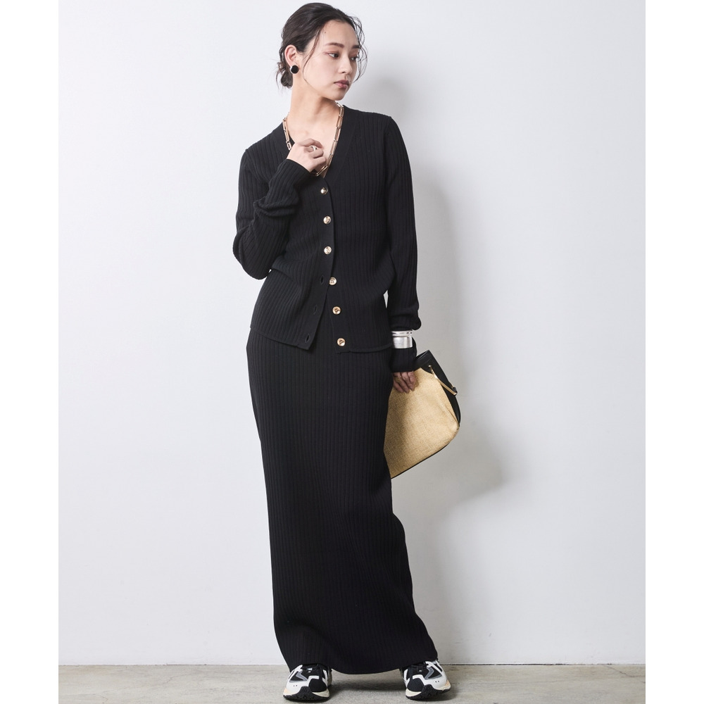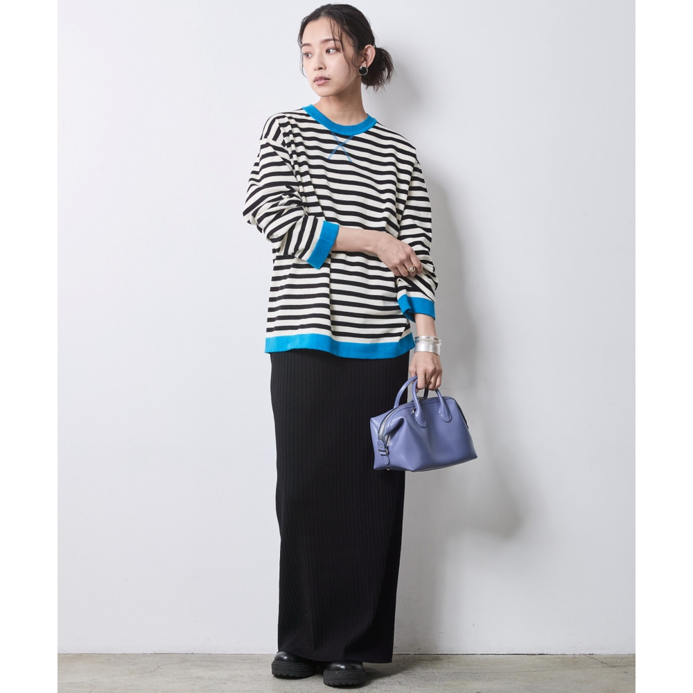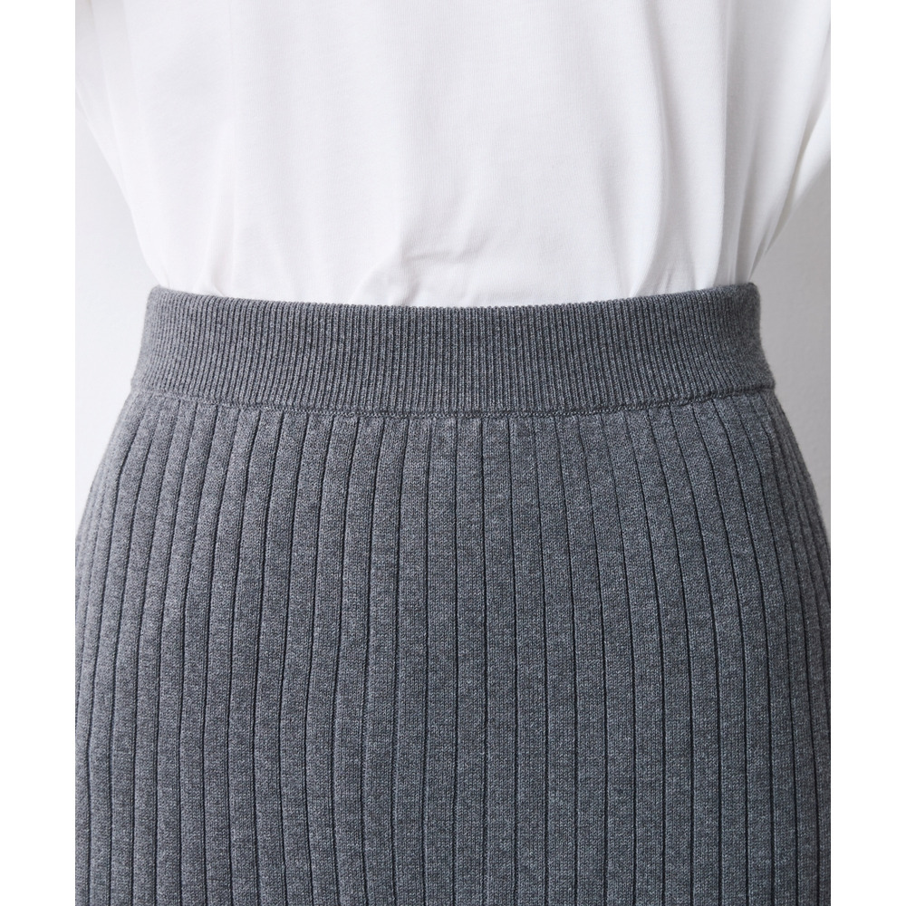 カジュアルなトップスも、リブスカートの縦ラインが加われば一気に洗練された表情に変わります。