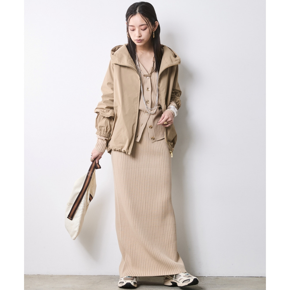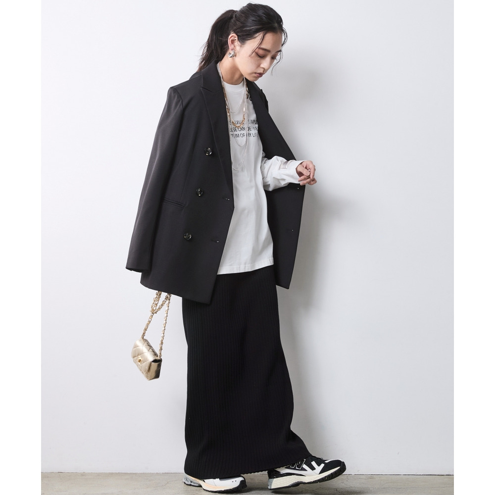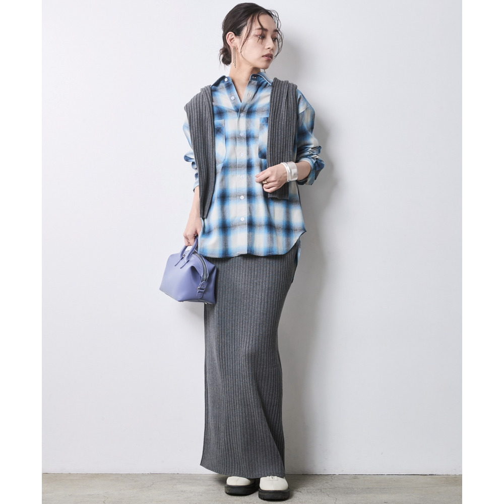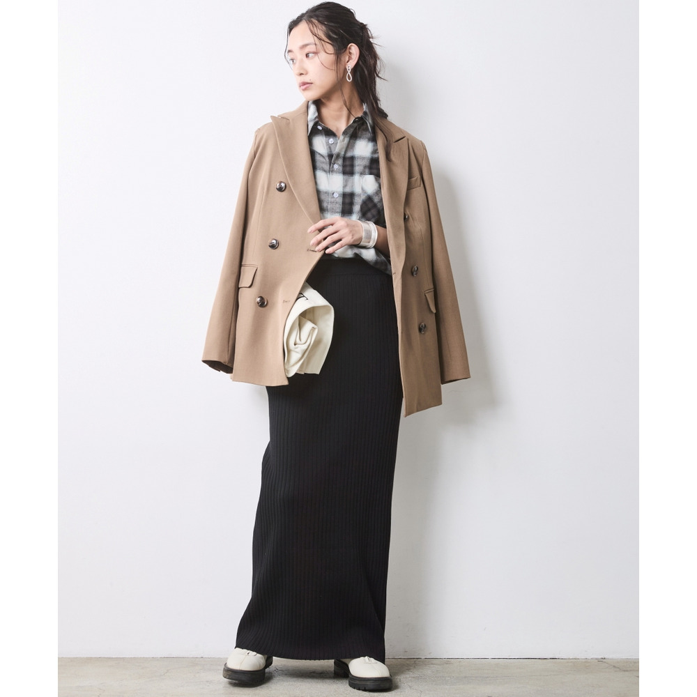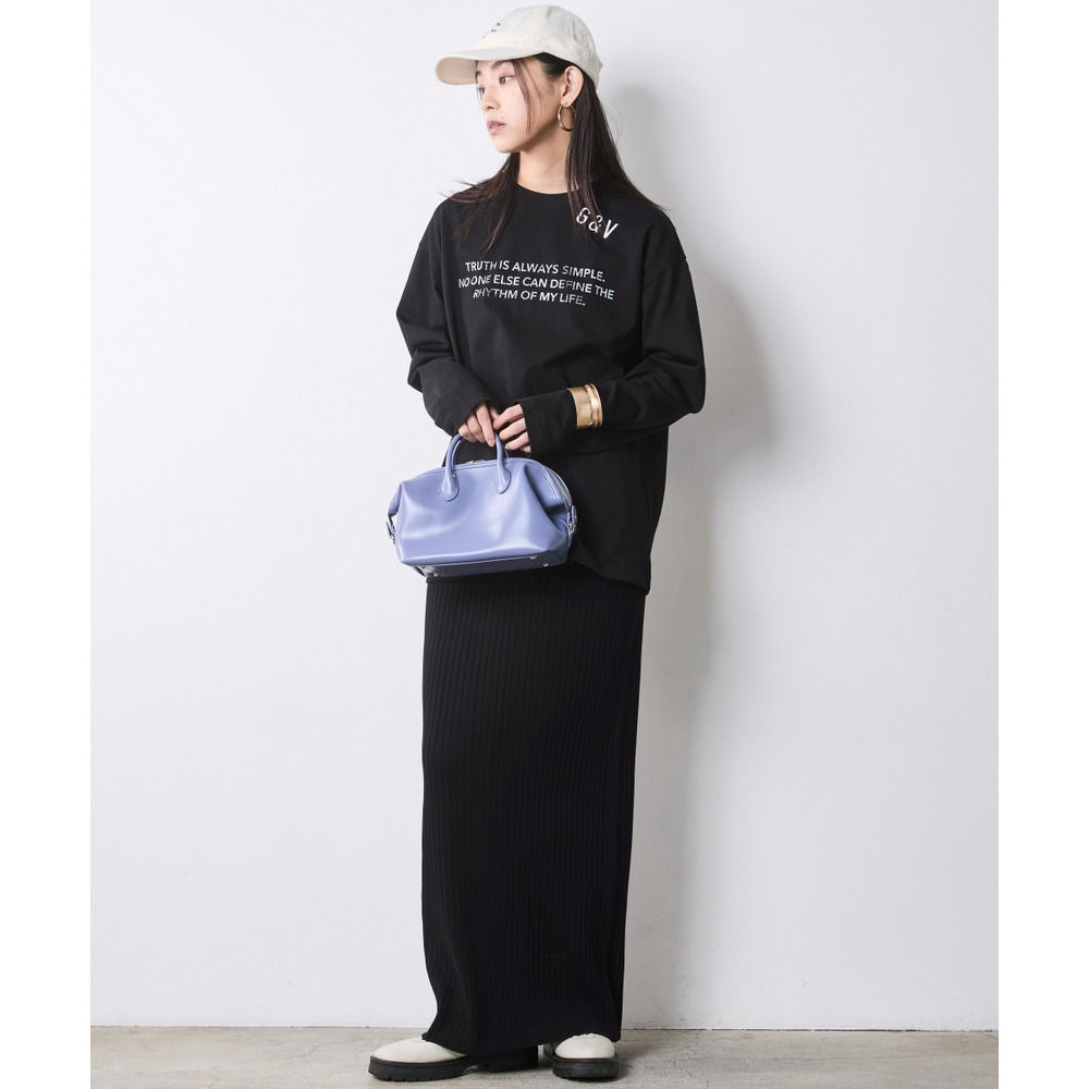 カジュアルなトップスも、リブスカートの縦ラインが加われば一気に洗練された表情に変わります。