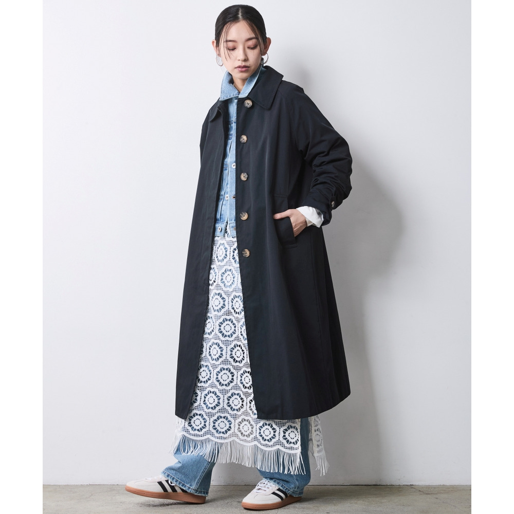 Urban Outer Look: バルマカーンコートの裾からワイドなデニムを覗かせて。