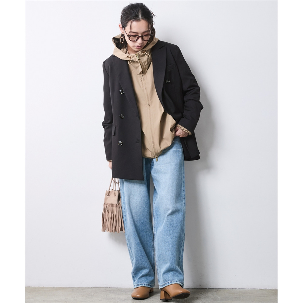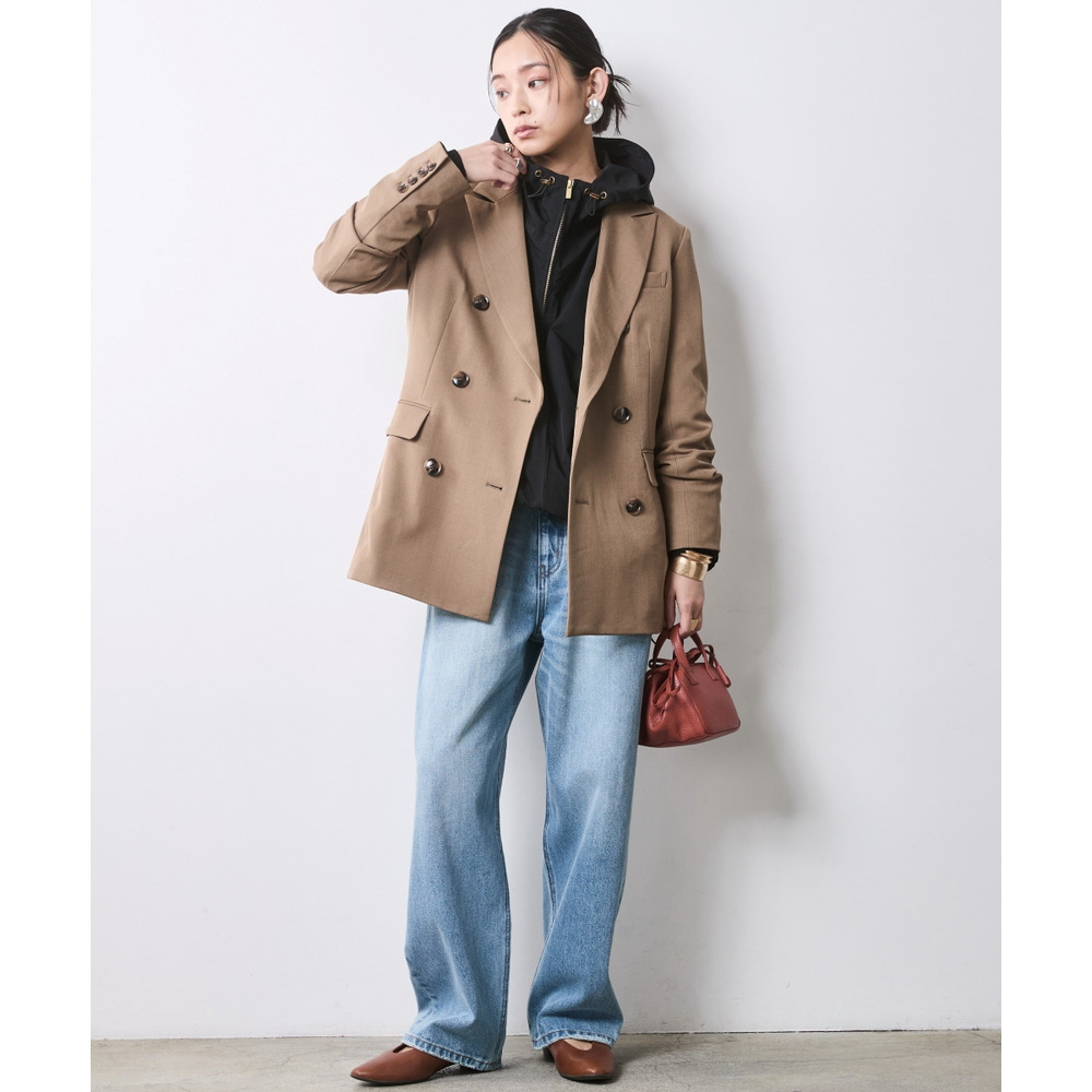 Sophisticated Mode: 端正なダブルジャケットにサングラスを添え、ルーズデニムを合わせた都会的なミックススタイル。