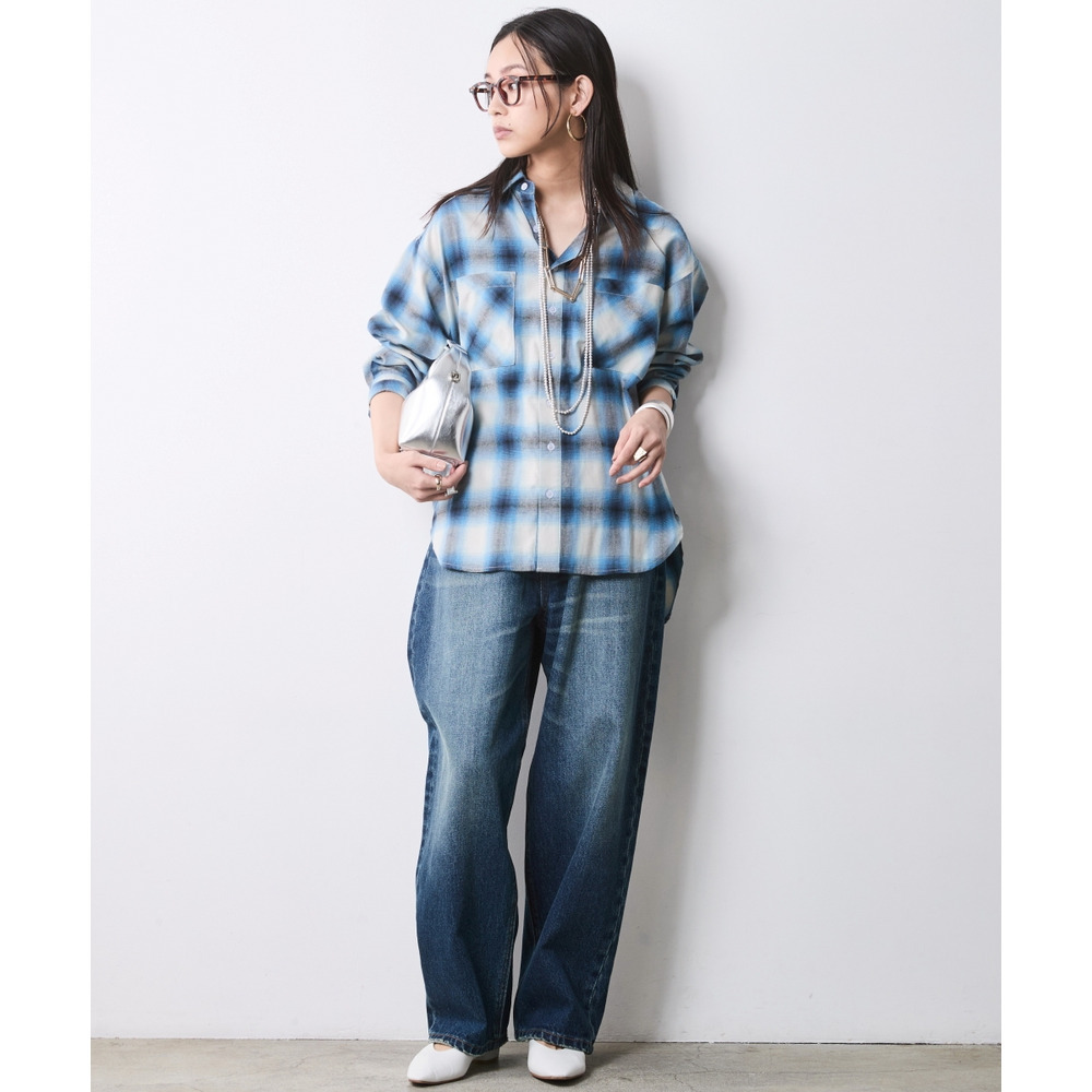 Effortless Trad: オンブレチェックシャツをラフに羽織り、パールの多連ネックレスで艶を足した、こなれ感漂う大人のトラッドスタイル。