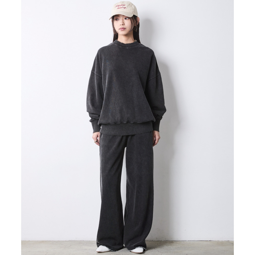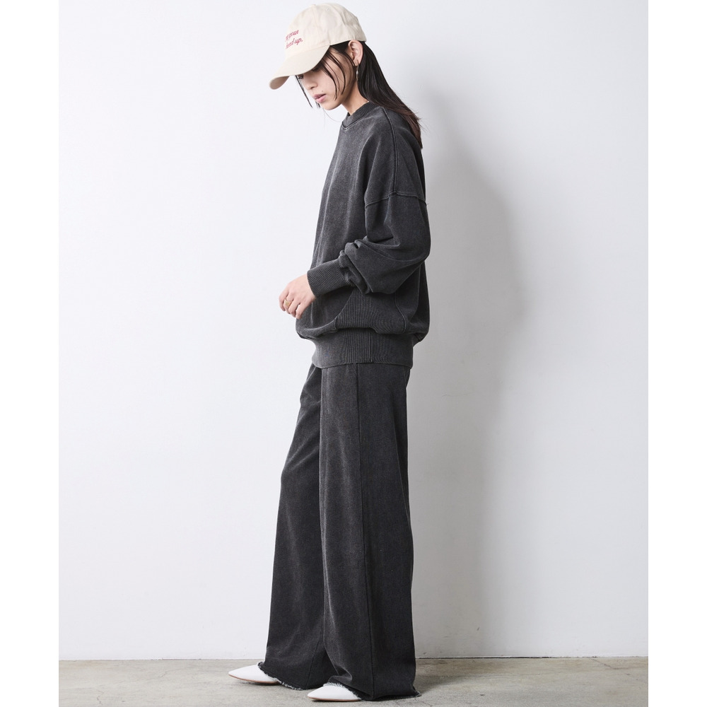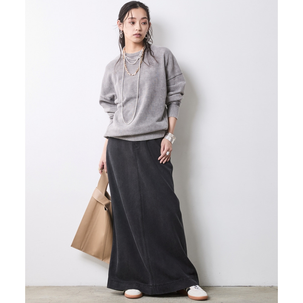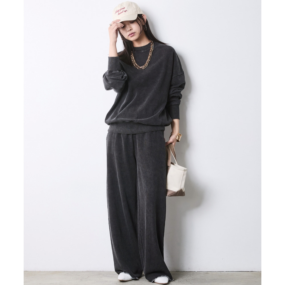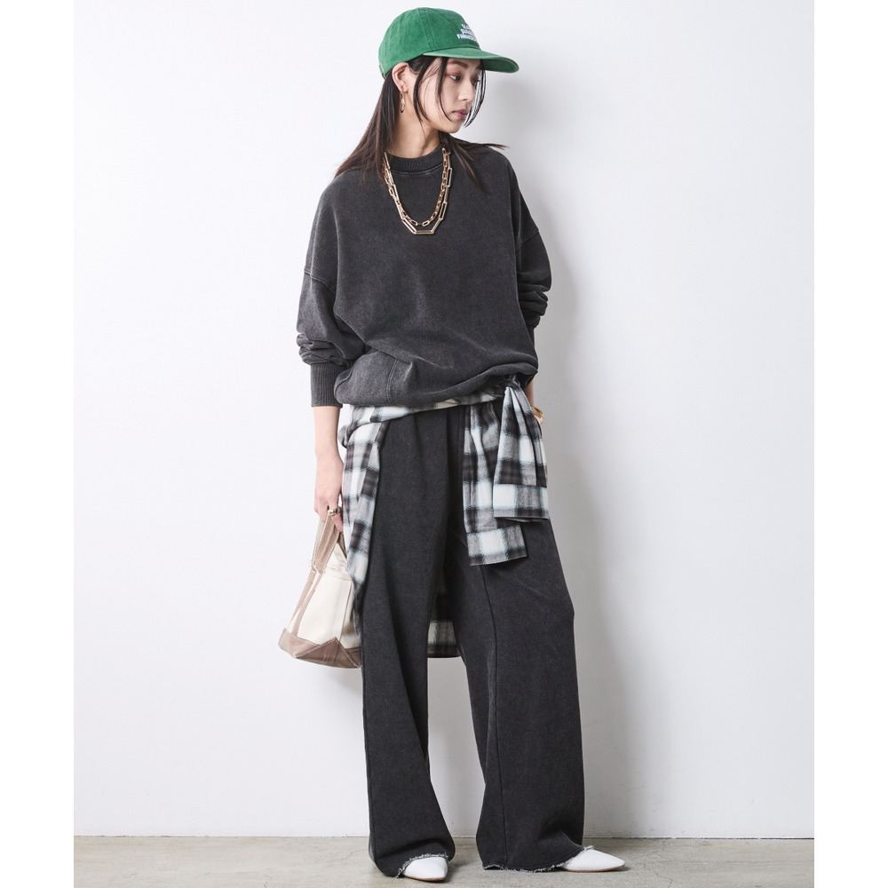 重ための裾周りと、スウェットのルーズなシルエットが絶妙な「今」のバランスを作ります。