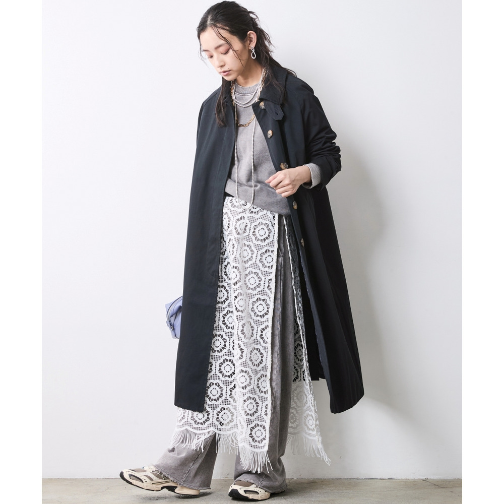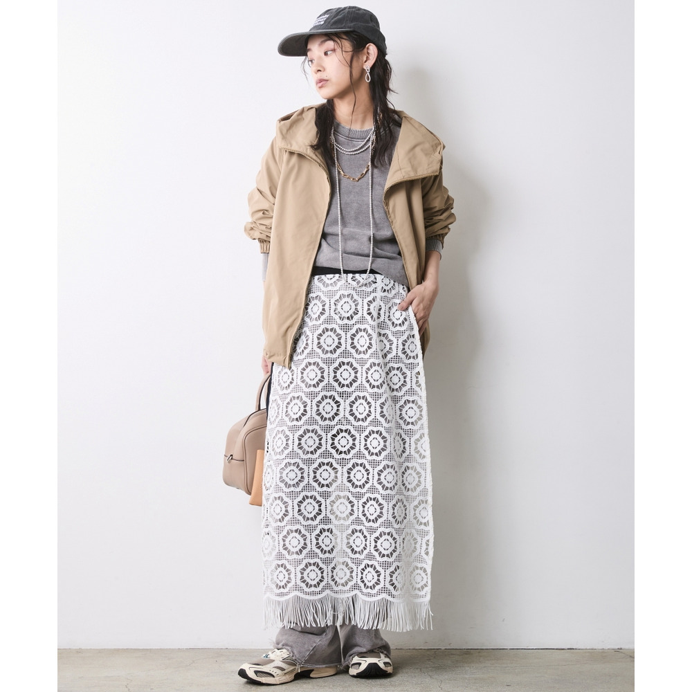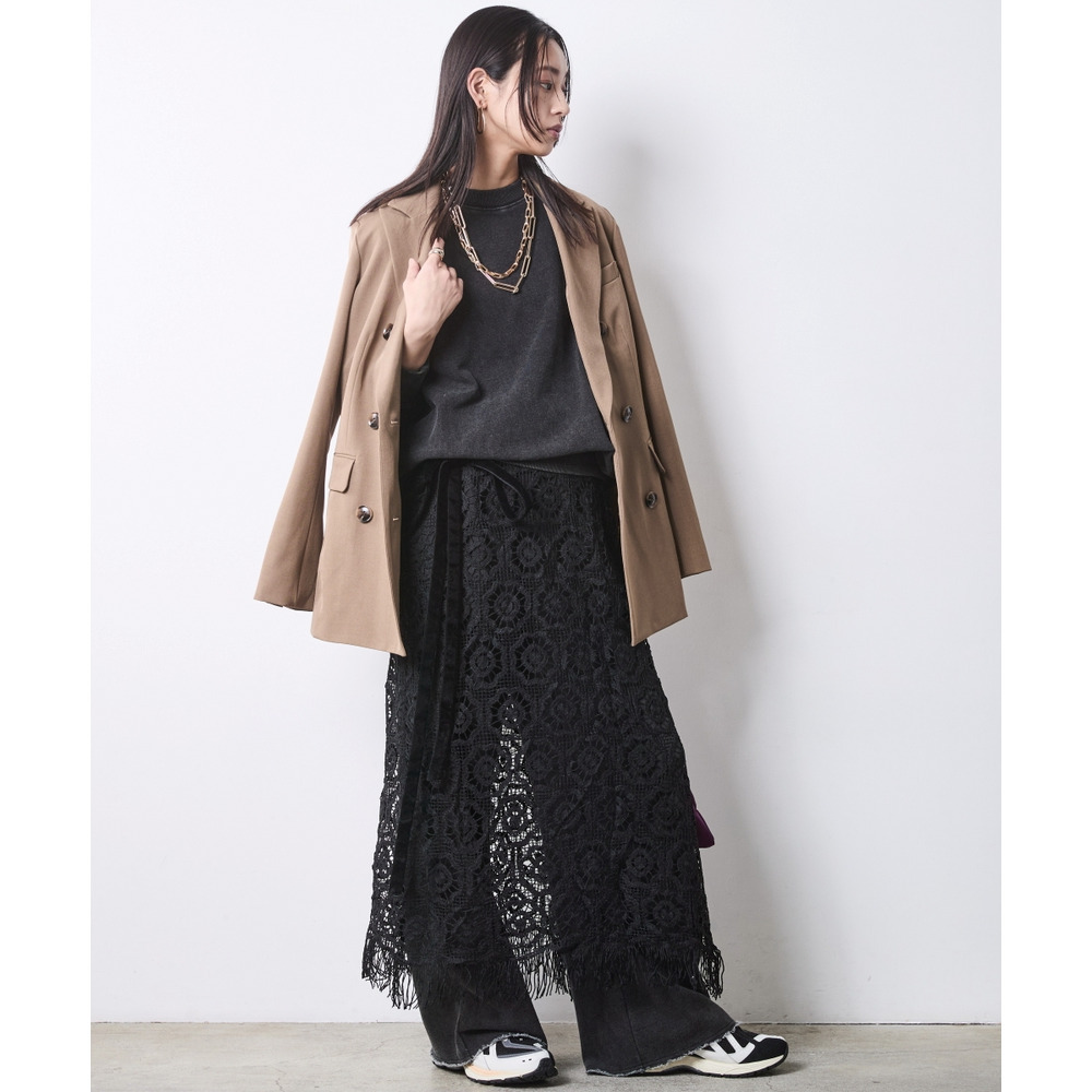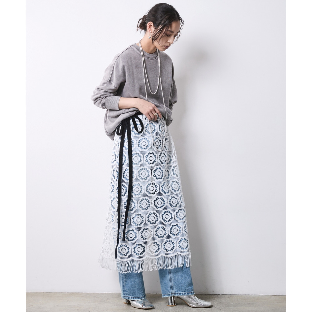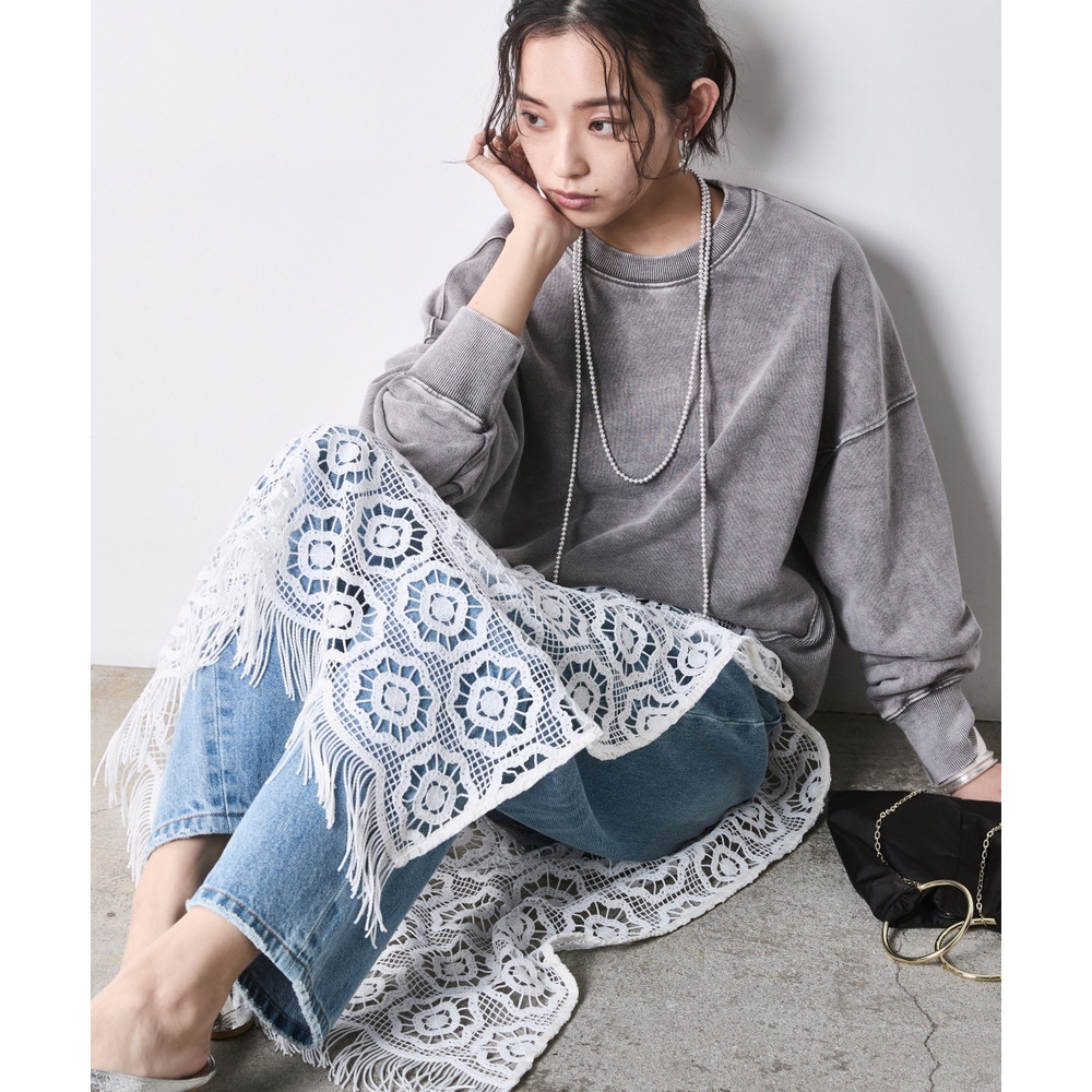 Lace & Sweat Layered: スウェットの無骨さと繊細なレーススカートをぶつけた、大人の上級レイヤードスタイル。