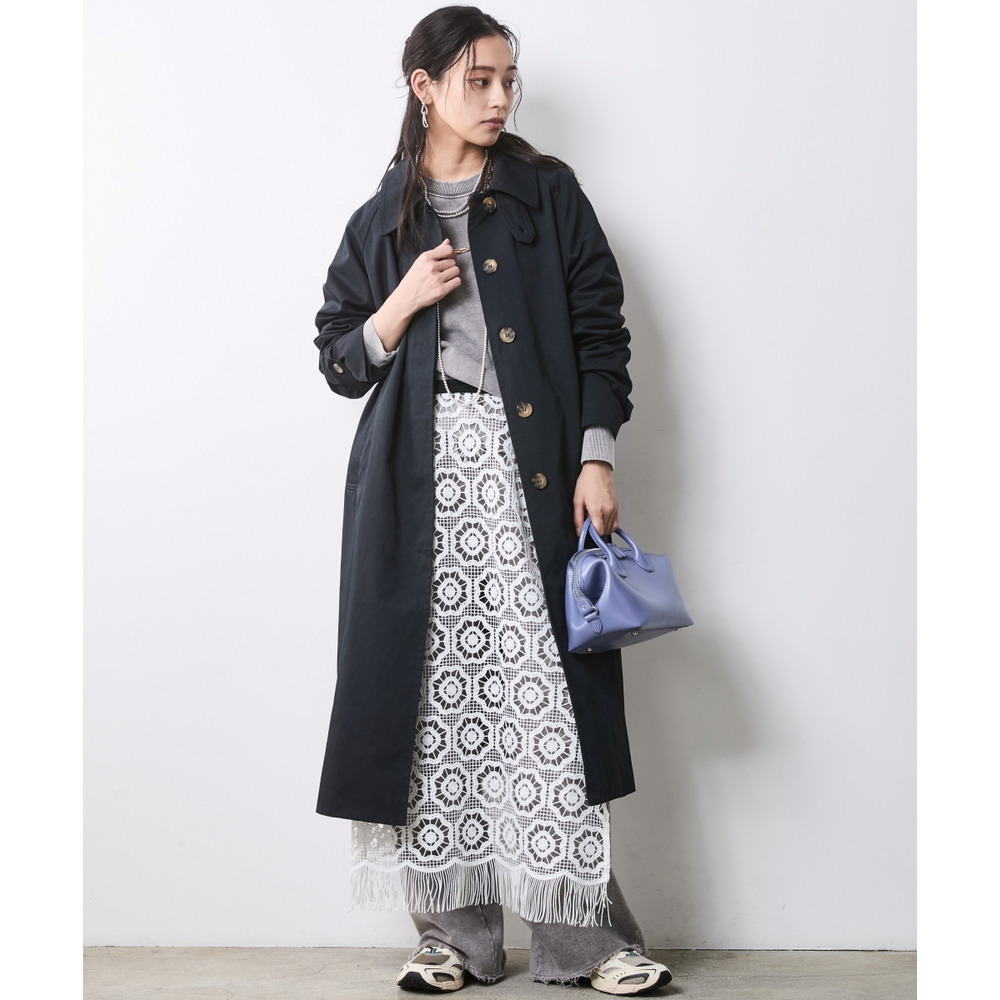 Feminine Layered: 繊細な幾何学レースのオーバースカートを重ね、無骨なスウェットに柔らかな奥行きをプラス。