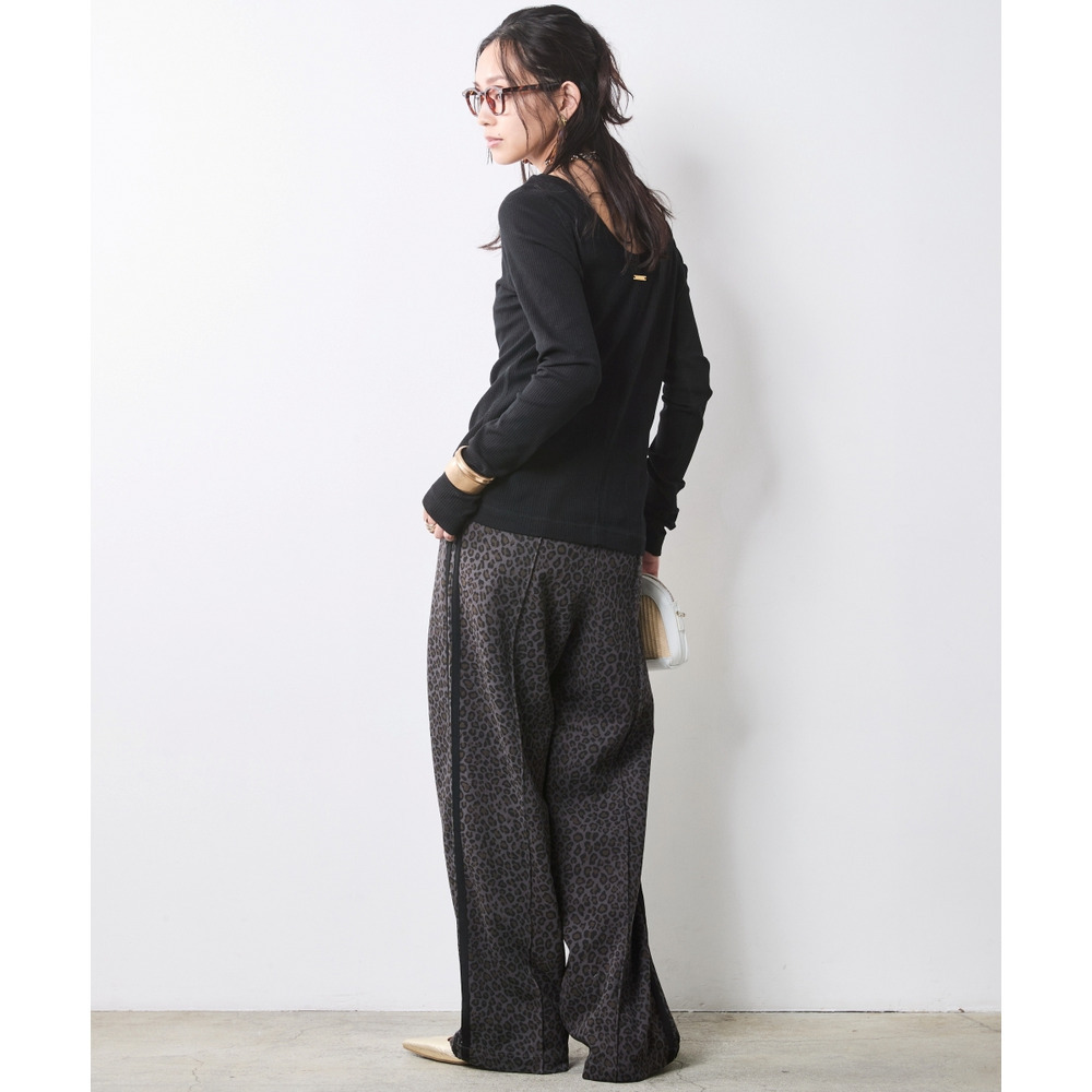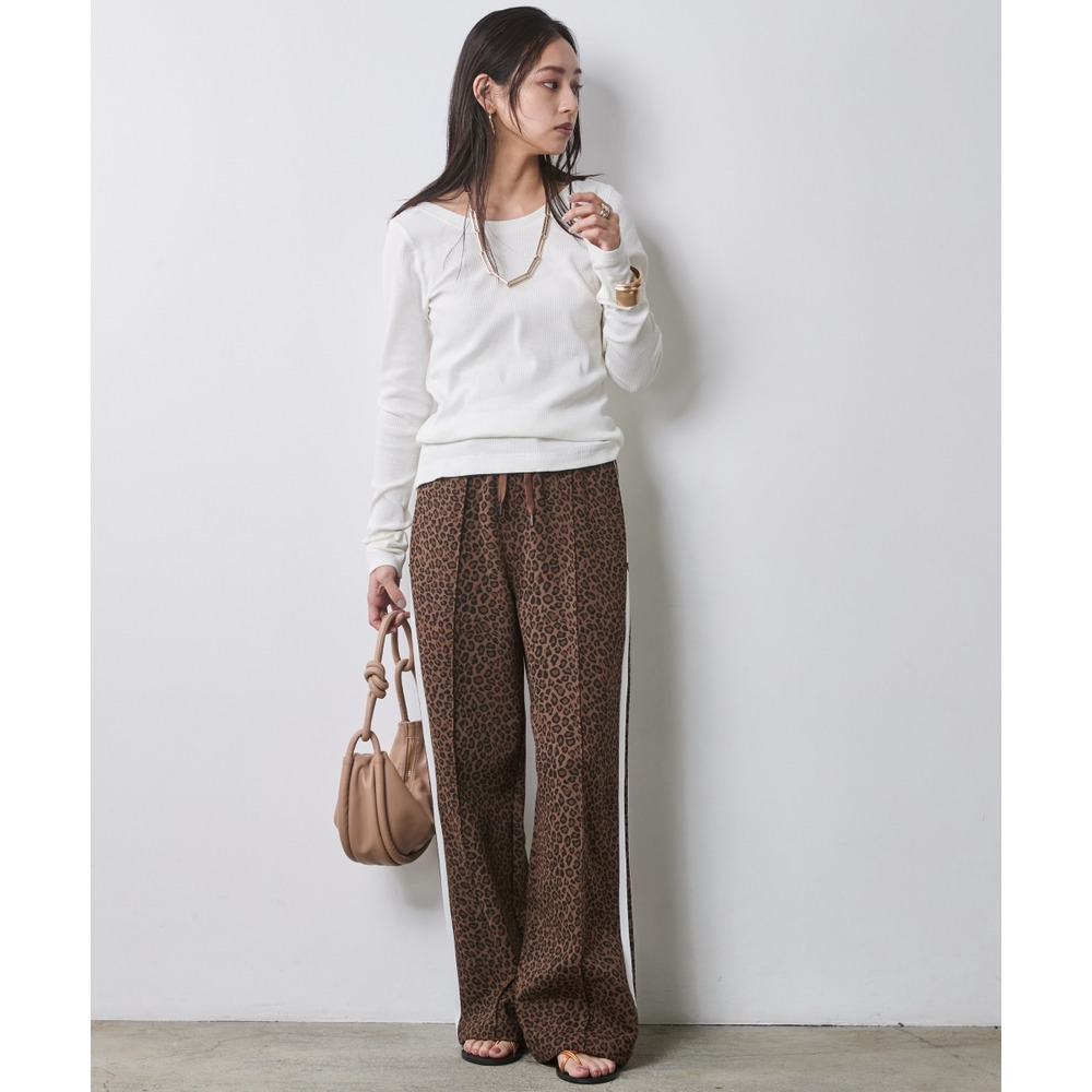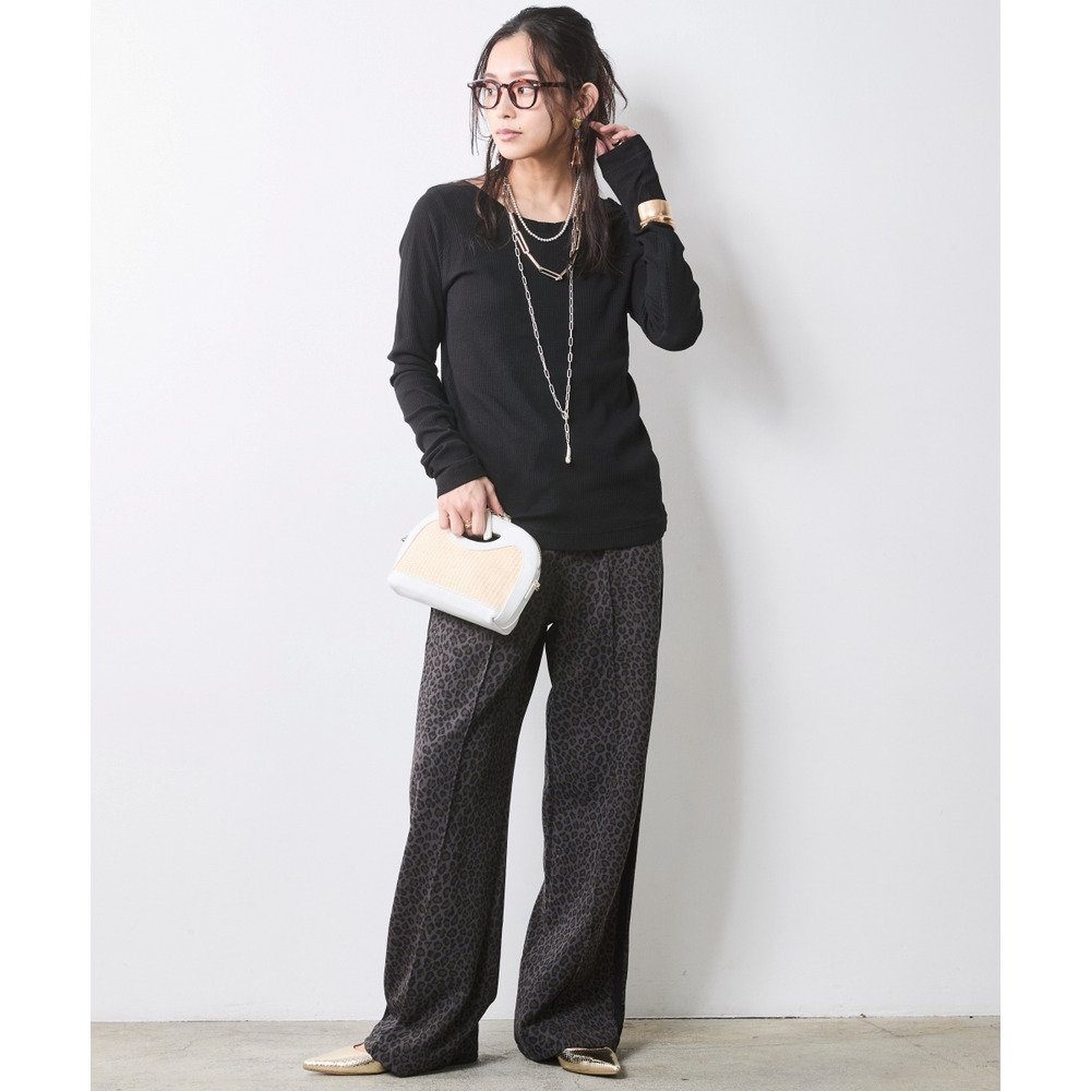Edgy & Feminine トレンドのアニマル柄ワイドパンツに、大ぶりのネックレスをレイヤード。