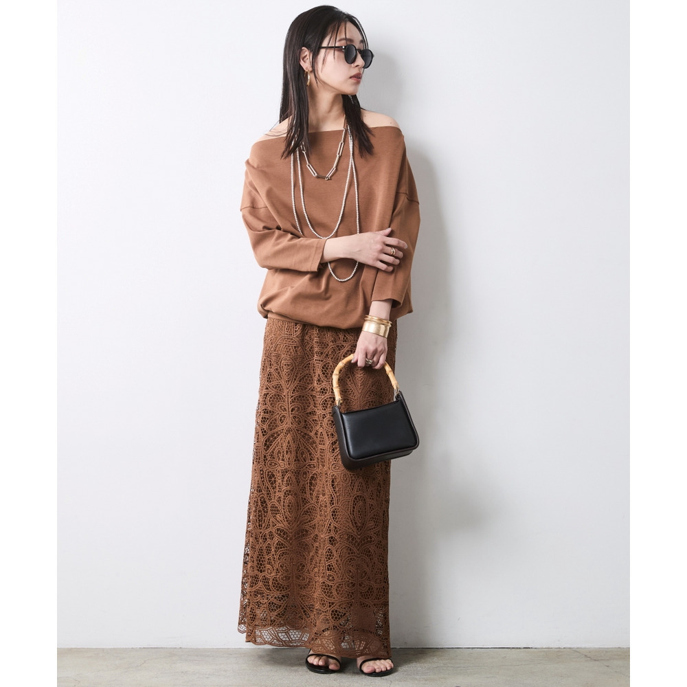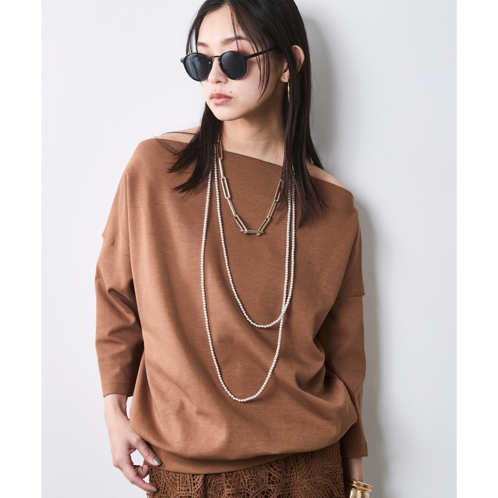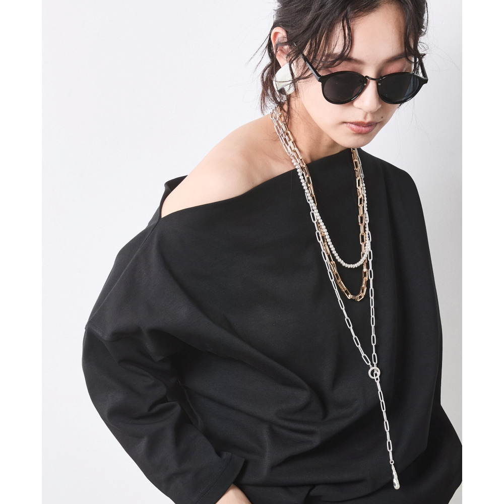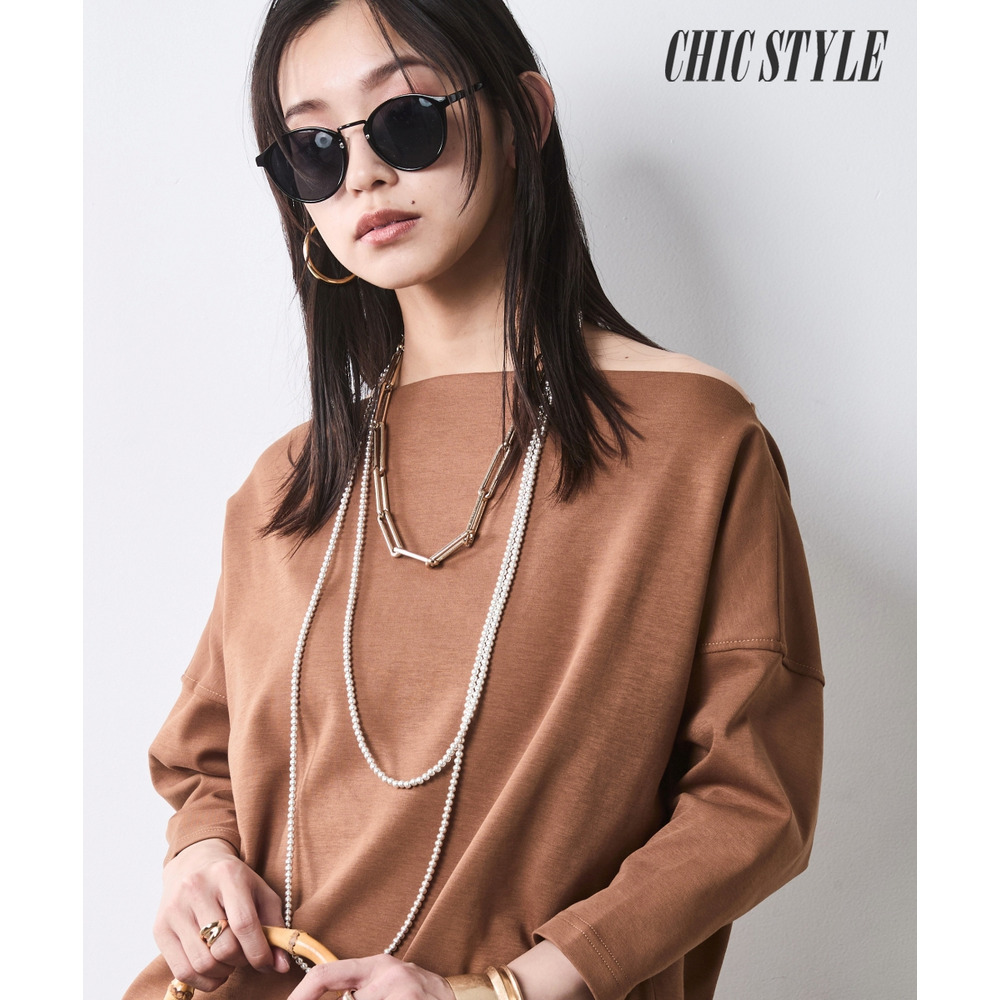 ネックラインを活かして、あえて大ぶりのパールやチェーンネックレスを重ねるのが「CHIC STYLE」流。