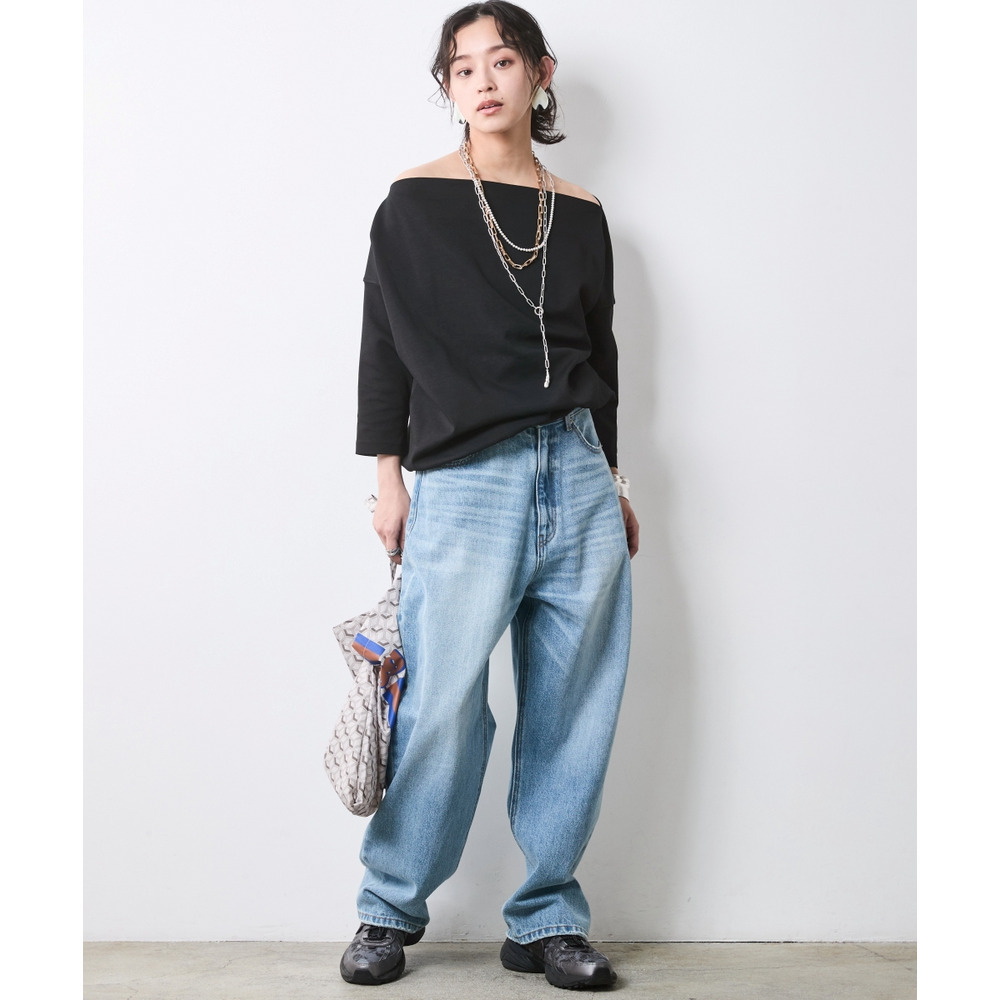 肩を少しだけ出したオフショルの着こなし、カジュアルなデニムも一気に女性らしく昇華されます。