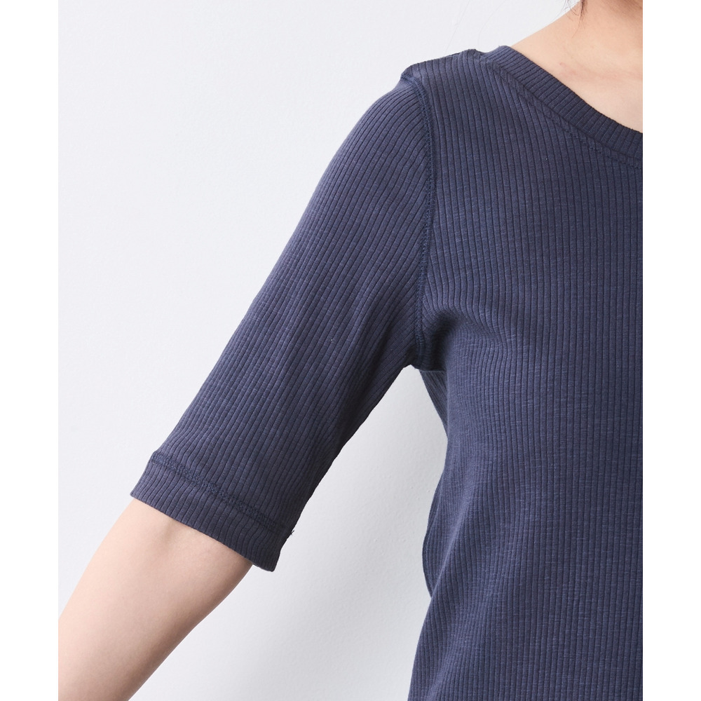 肘の少し上までを覆う絶妙な5分袖は、二の腕をスマートにカバーしつつ、手首の華奢さを強調。