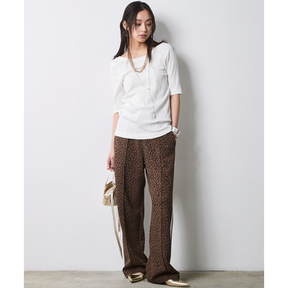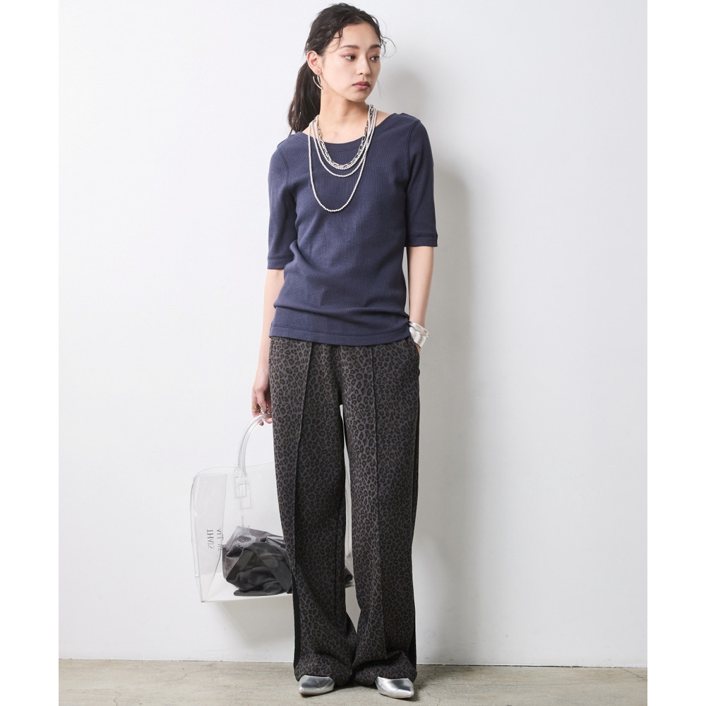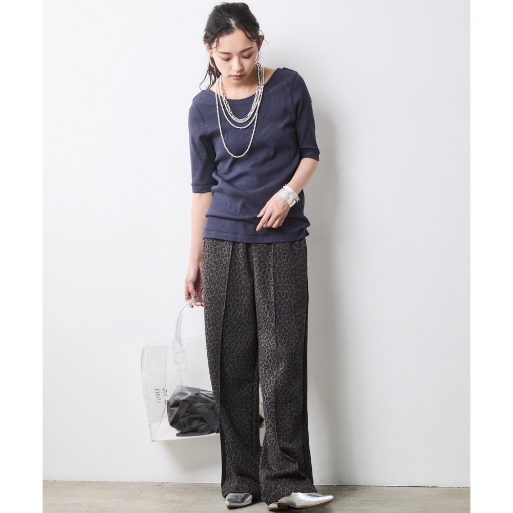 Urban Spice Look:ネイビーのプルオーバーに、トレンドのレオパード柄ワイドパンツを合わせて。
